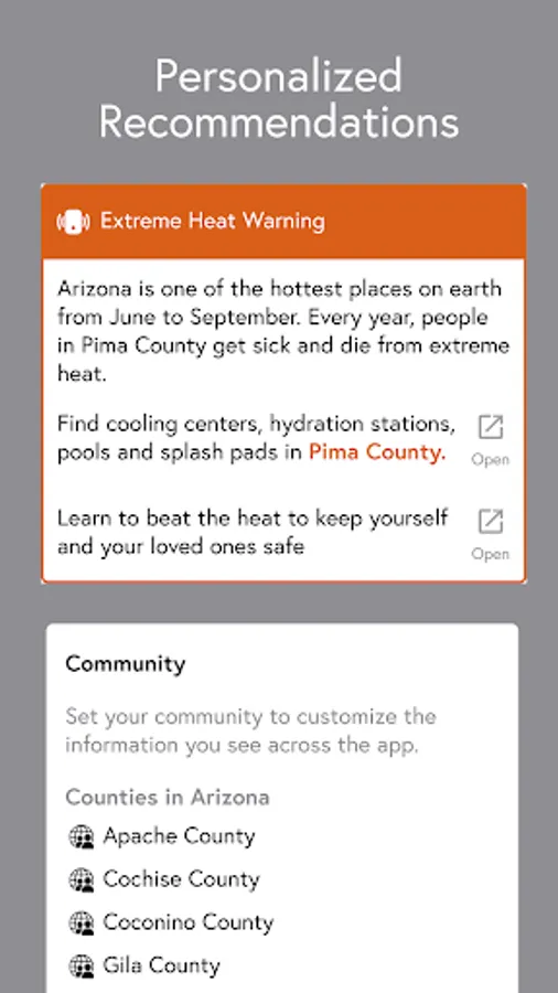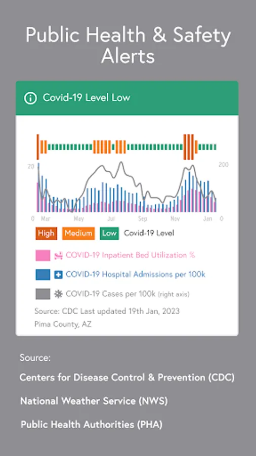 Receive important public health and safety notifications from trusted sources. Covid-19 community level alerts from CDC, weather safety alerts from National Weather Service and other alerts from your local public health departments. Prepare and respond with personalized recommendations that help keep everyone safe.