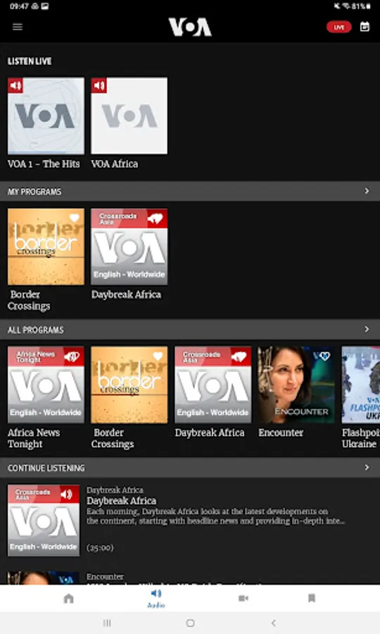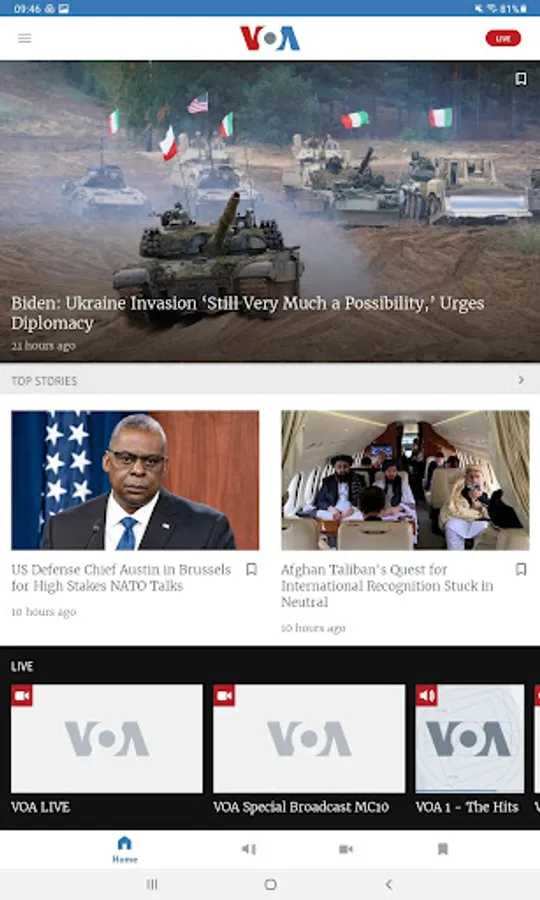 The free, *official* Voice of America (VOA) mobile / tablet application serves news to your mobile device or tablet. VOA operates one of the world's largest international news media networks on TV, radio and digital properties with a total weekly audience of more than 200 million people around the world, including Africa, The Middle East, Asia and beyond. To do this, VOA employs more than 3,500 journalists, focused on countries without a free or established press or free and open internet access.