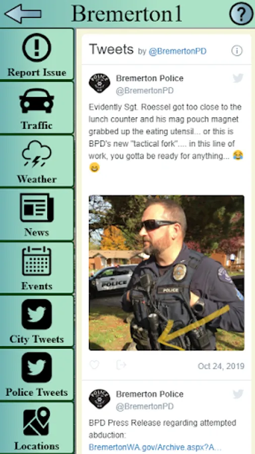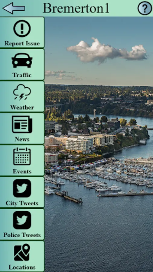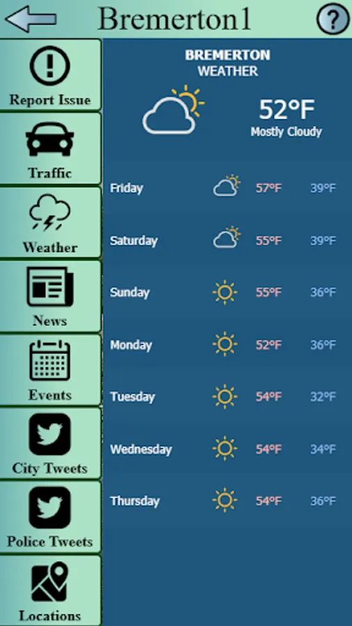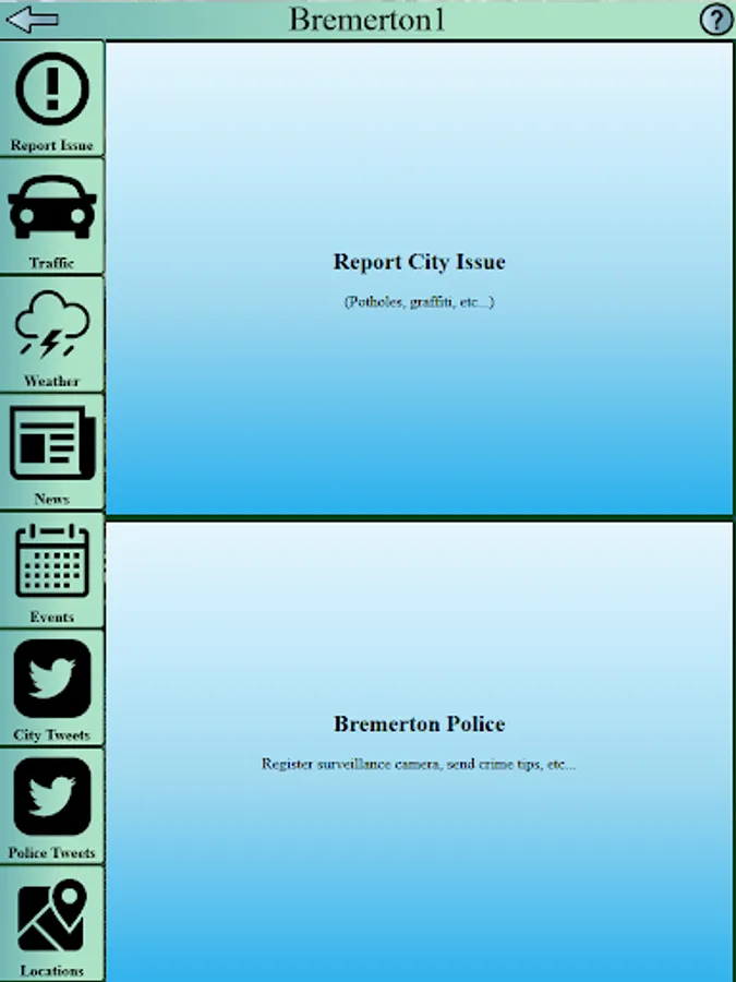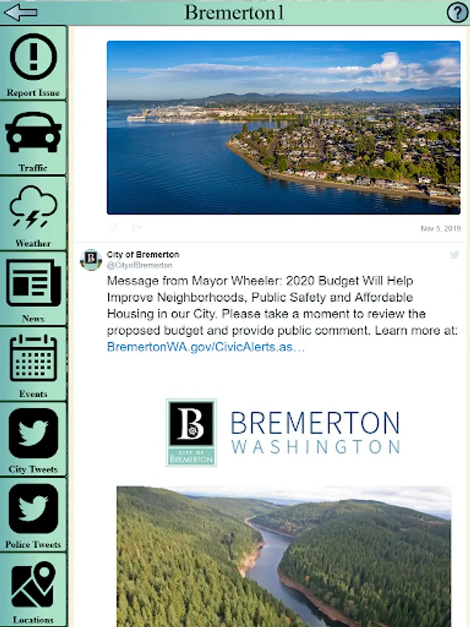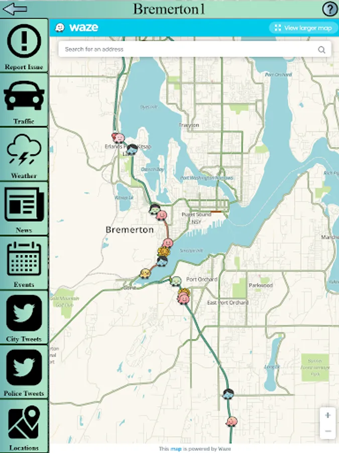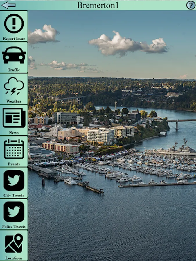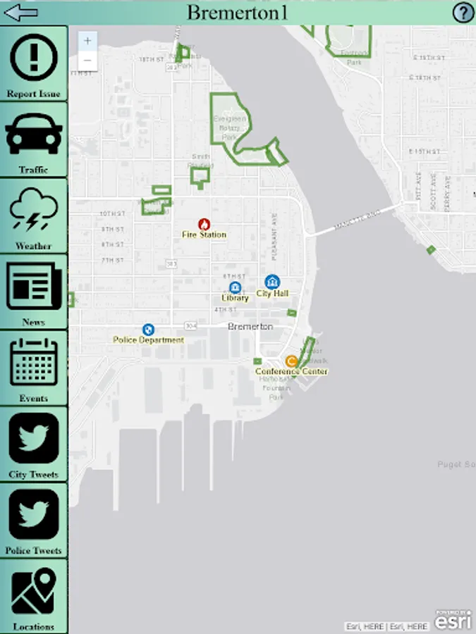 Other features include viewing the City of Bremerton's calendar events, latest news, traffic conditions, weather forecast, and a map of Bremerton's fire departments, city hall, parks, and more.