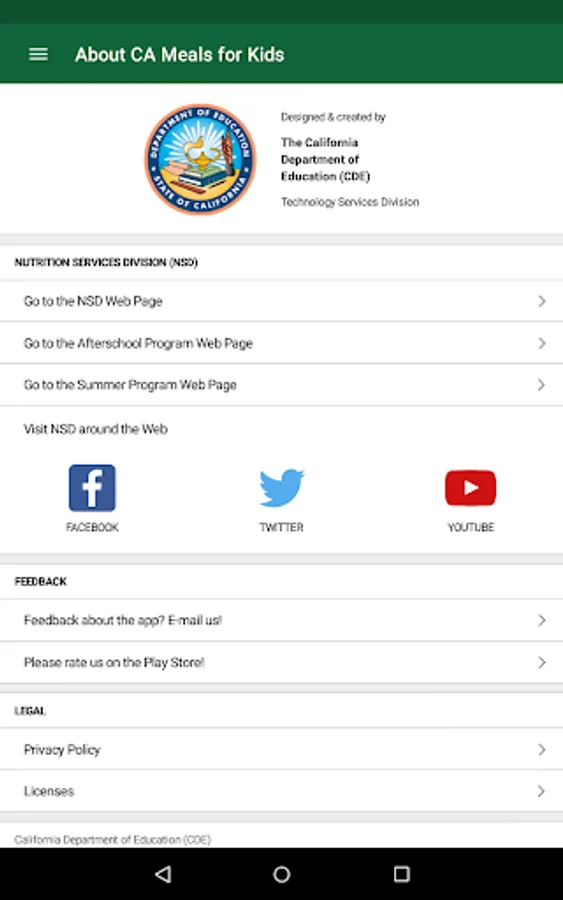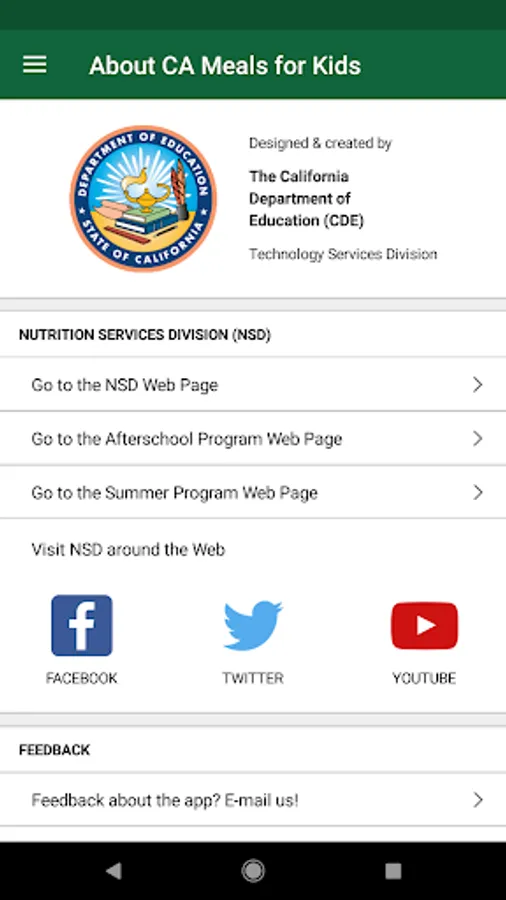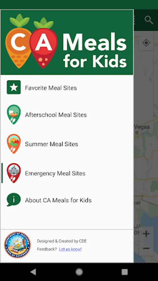 The CA Meals for Kids app was designed and created by the California Department of Education to share our collected site data. We hope you find this app useful. Please let us know if you have suggestions for improvements or features you'd like to see!