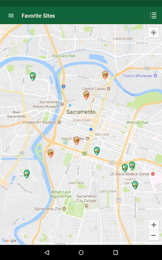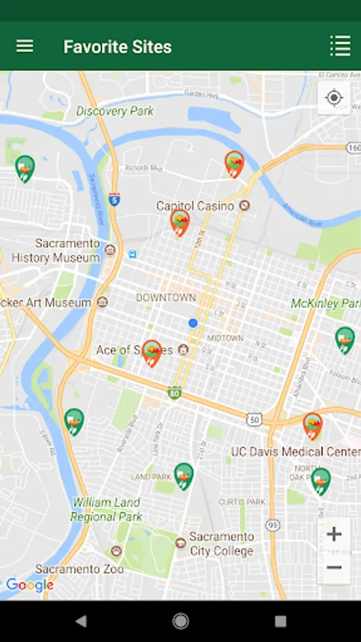 Search results are displayed as pins on an intuitive map view as well as a sortable list view. You can save favorite sites for later as well as share your results with friends and family.