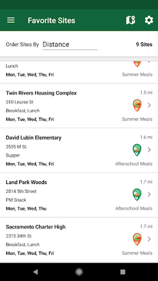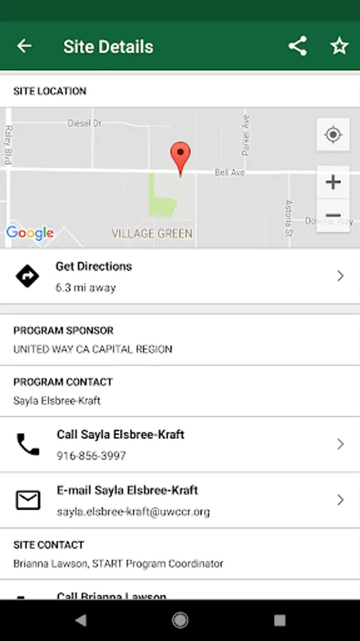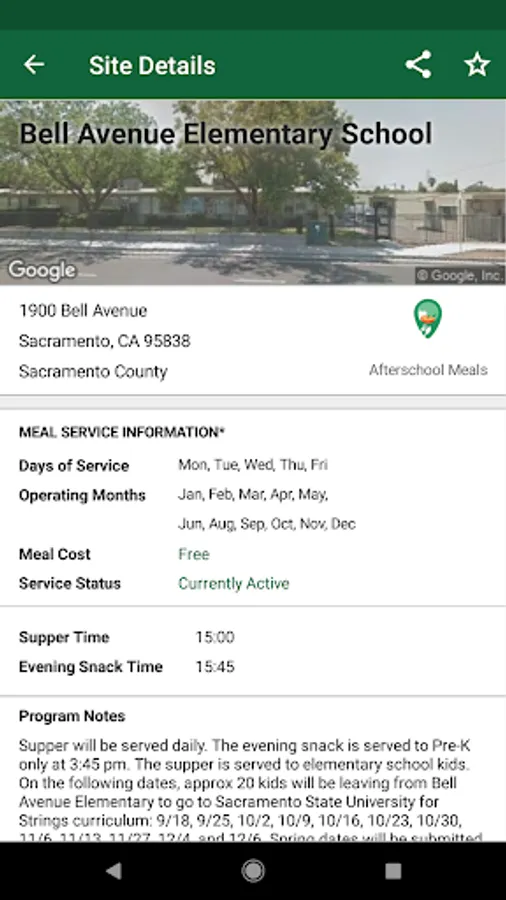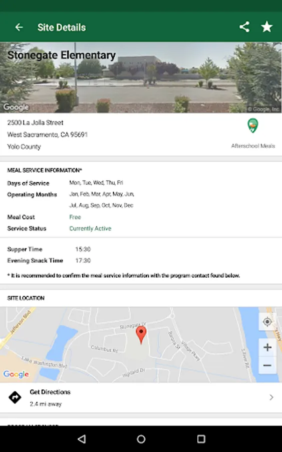 Selecting a site you're interested in will display site information collected by the California Department of Education that includes meal days and times as well as contact information for the local sponsor. You can view the feeding location and access driving directions directly from the app.
