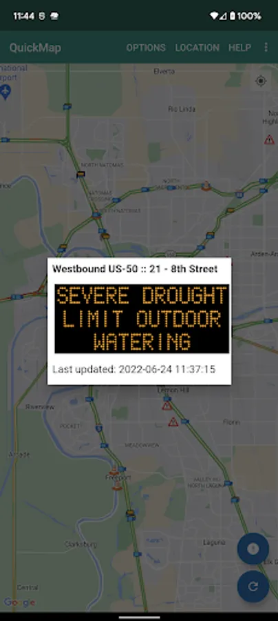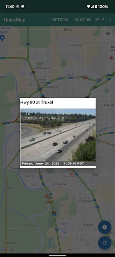 Set which of these options to display and QuickMap will remember your preferences. Zoom to a view of other parts of California with the Location button. Click on traffic camera icons to see a camera image. Click on a CHP, lane closure, changeable message sign or chain control icon to view details for that marker.