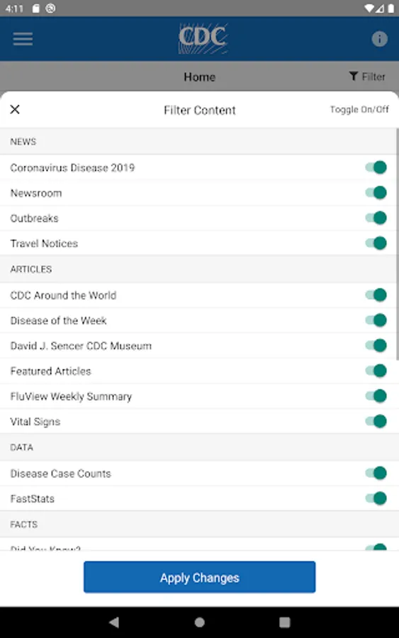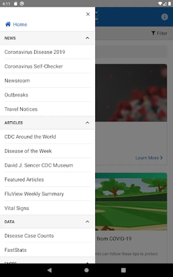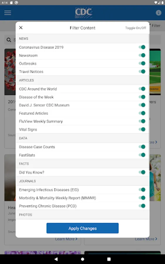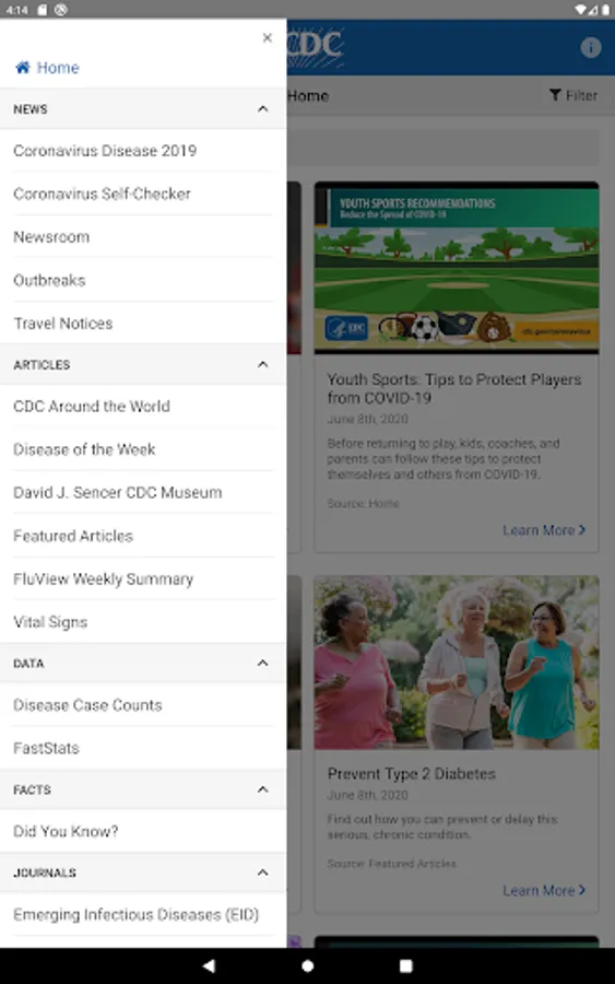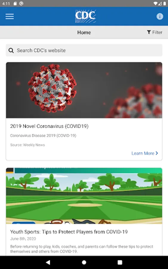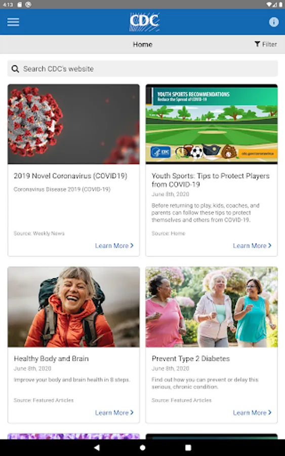 Browse Featured Articles, stay on top of health news in the Newsroom section, and view CDC Images of the Week. If you’re a journal reader, view the latest Morbidity & Mortality Weekly Report, Emerging and Infectious Disease journal, or the latest on Preventing Chronic Diseases. You can even search CDC’s web content from the app.