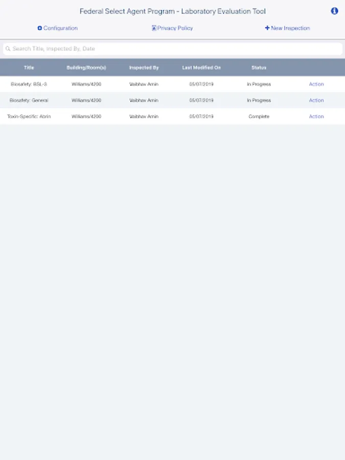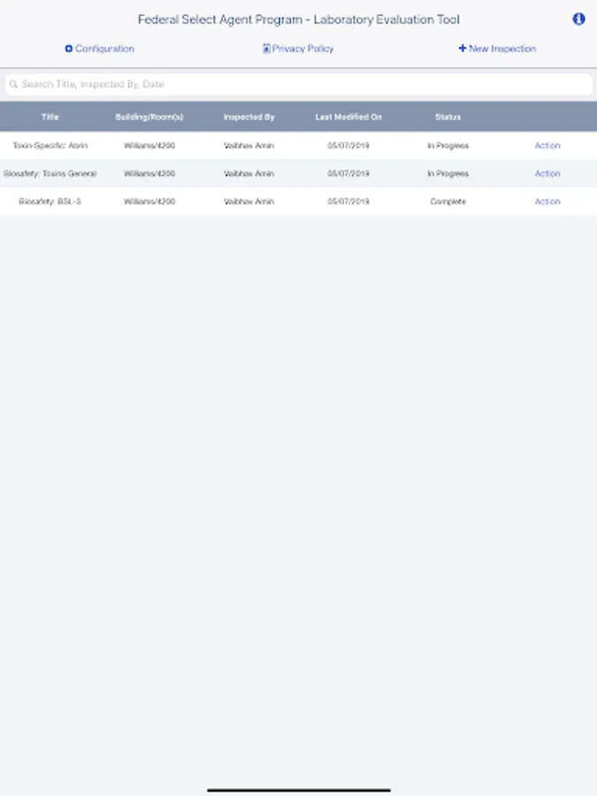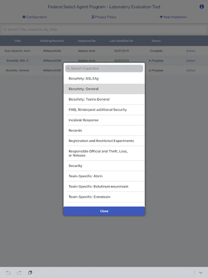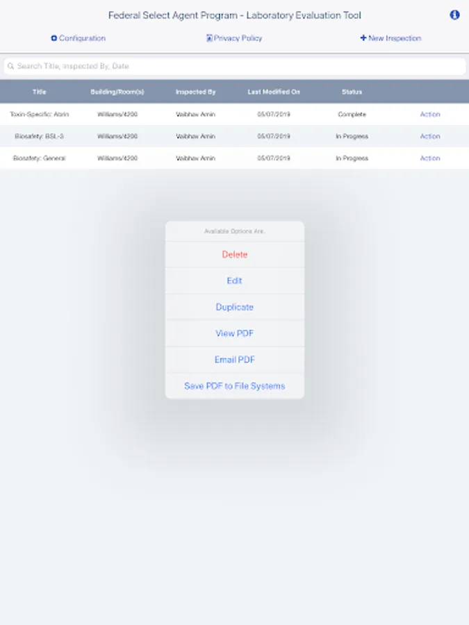 The tool allows the user to print a single PDF document summarizing the recorded findings. The tool also allows the user to record any corrective actions taken in response to identified findings. The resulting PDF document can be stored locally, saved to a facility’s computer, or emailed to someone using the default client of the system.