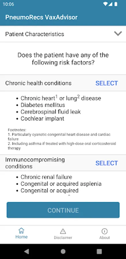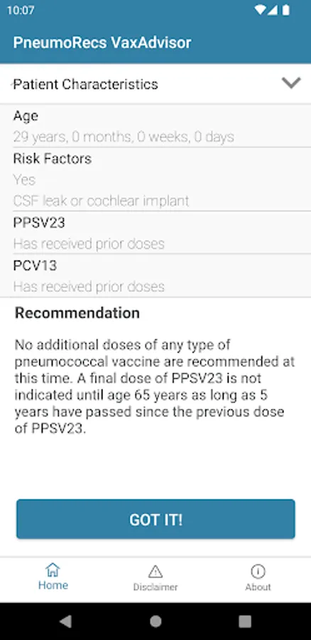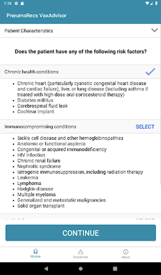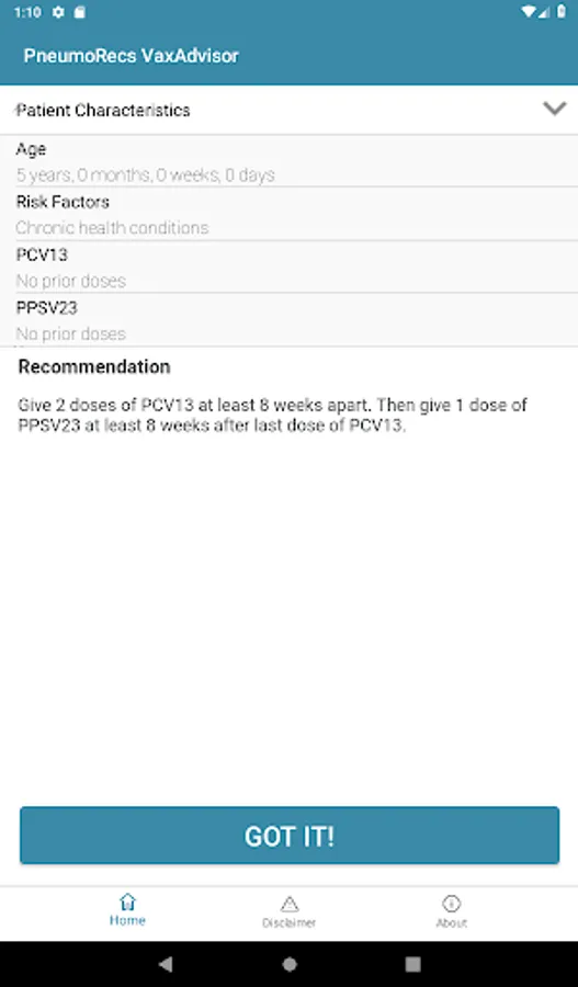 This is the PneumoRecs VaxAdvisor App created by the Centers for Disease Control and Prevention (CDC) in collaboration with the Georgia Tech Research Institute. PneumoRecs VaxAdvisor provides patient-specific pneumococcal vaccination guidance consistent with the pneumococcal vaccination recommendations of the Advisory Committee on Immunization Practices. Vaccination providers enter a patient’s age and respond to prompts about the patient’s pneumococcal vaccination history and underlying medical conditions. The app then displays patient-specific pneumococcal vaccination recommendations consistent with the recommended U.S. immunization schedule.