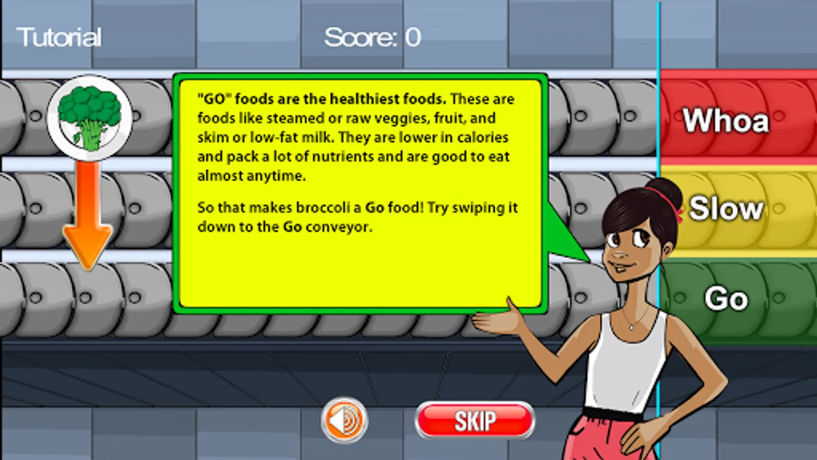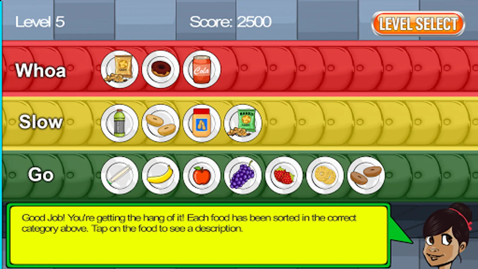 In each level you’ll sort foods coming down a conveyor belt into three categories: Go, Slow, or Whoa. Earn points by putting foods into the correct category.