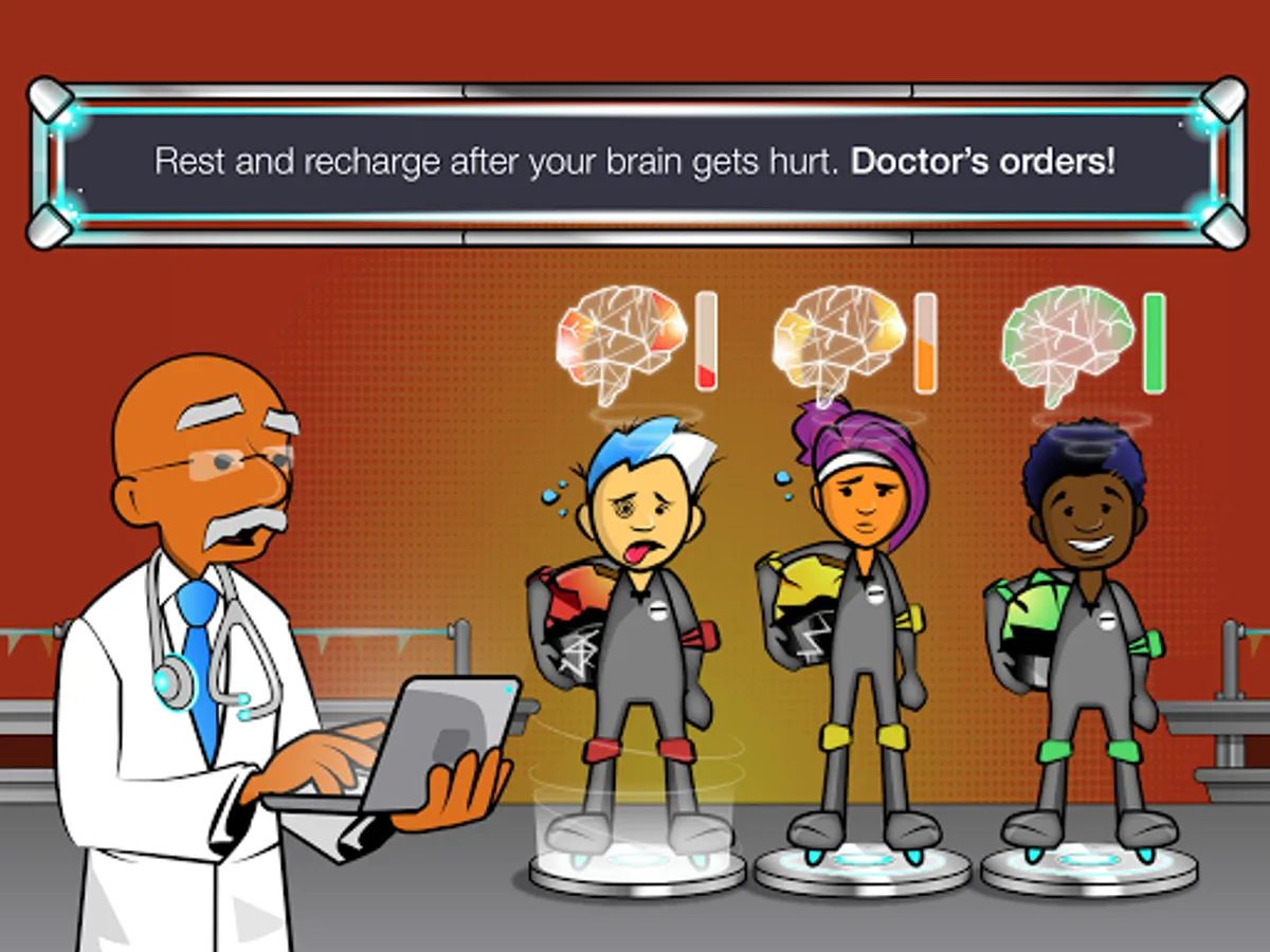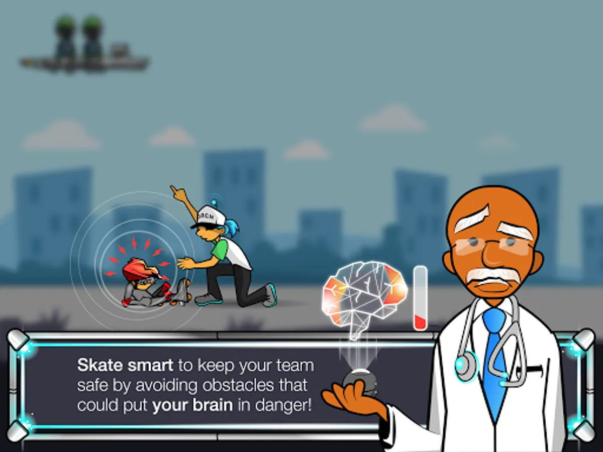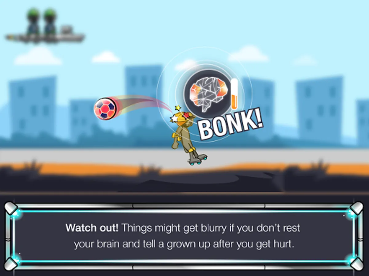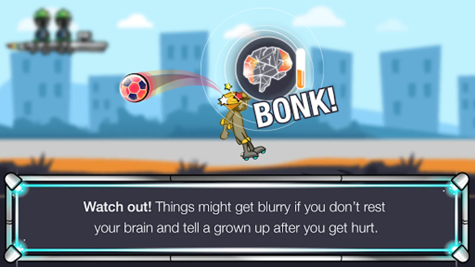 Children must keep their players safe by avoiding obstacles that could lead to a concussion and make smart choices about resting players who have a concussion. When players are injured the game simulates concussion symptoms, making the screen blurry and play more challenging. At the end of each level, a doctor checks out all the players to make sure they are healthy to race, and their brains are rested and recharged.
