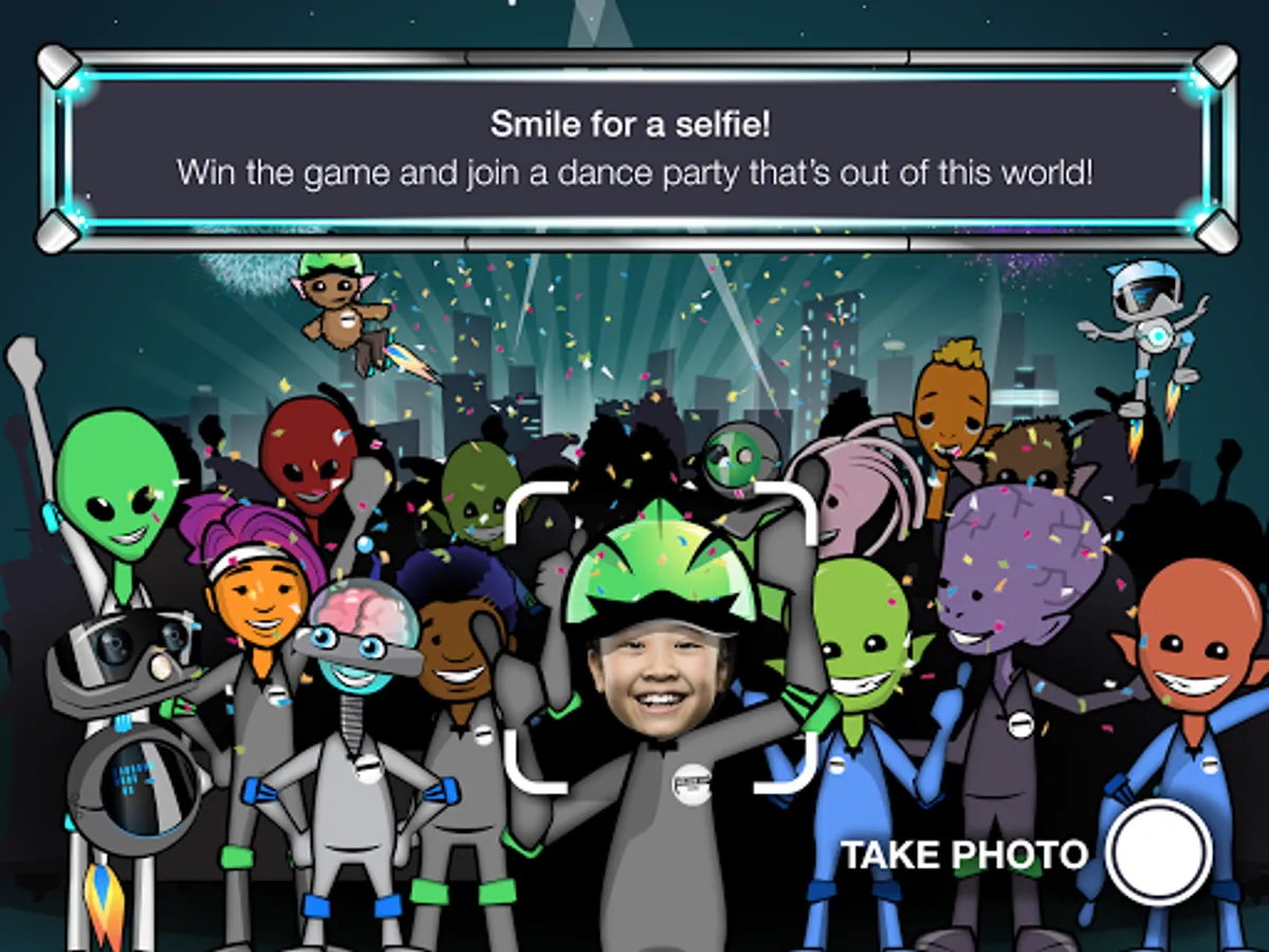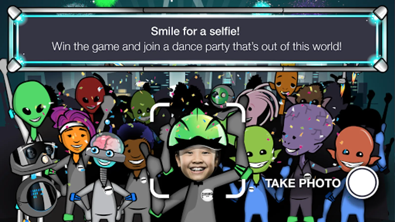 As children skate through levels they collect power gems. Power gems fuel up a spaceship that will blast off to Galactic City for a winner’s all-star dance party that is out of this world! As an added bonus, children can take a selfie and insert themselves into the dance party.