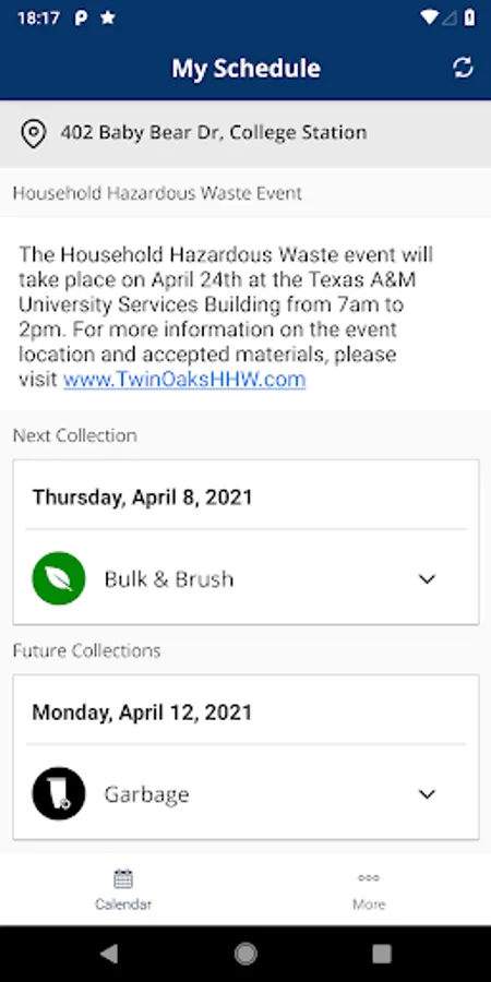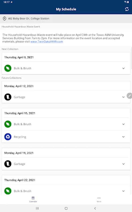 Garbage and recycling schedules and reminders for College Station TX. View your garbage and recycling schedule and receive collection notifications all from within this app.