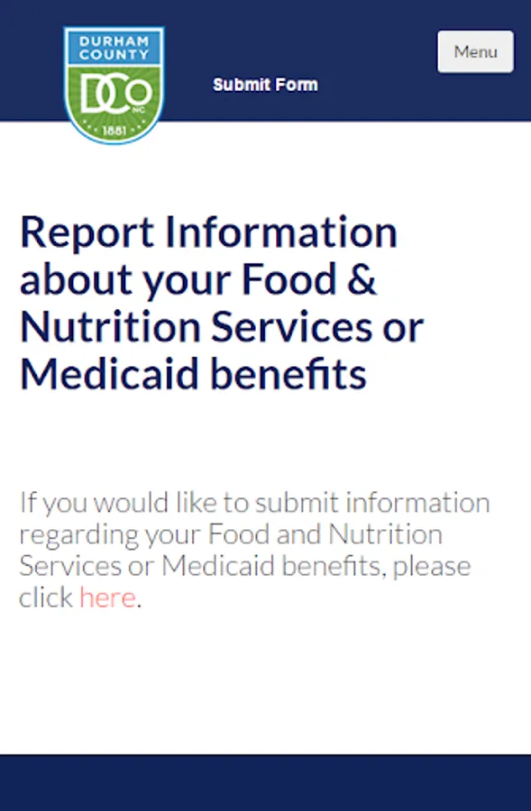 Report Information and forms about your Food & Nutrition Services or Medicaid benefits to Durham County Social Services from your mobile phone. You must be an existing client to use this app, otherwise please come to the Health and human services building to register. Also referred to as the DSS Mobile App.