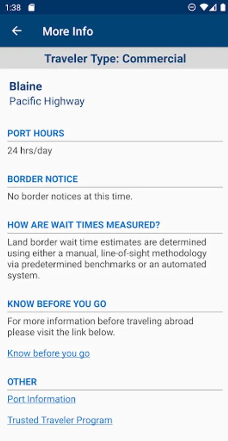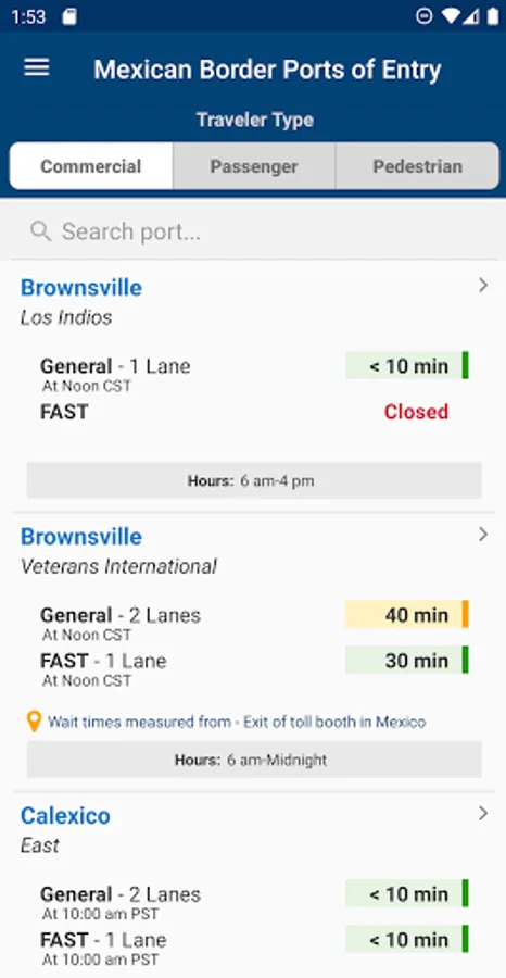 Knowing land border wait times at the various ports of entry into the United States from both Canada and Mexico can aid the traveler in making an informed decision on when and where to cross the border. The U.S. Customs and Border Protection's Border Wait Times (BWT) app provides estimated wait times and open lane status 24/7 at ports of entry that process commercial vehicles, passenger vehicles, and pedestrians. The BWT app breaks down wait times at each crossing by lane type (Standard, Sentri, FAST, Ready Lane, Nexus, etc.) The BWT app is a free service provided by the Department of Homeland Security/U.S. Customs and Border Protection.