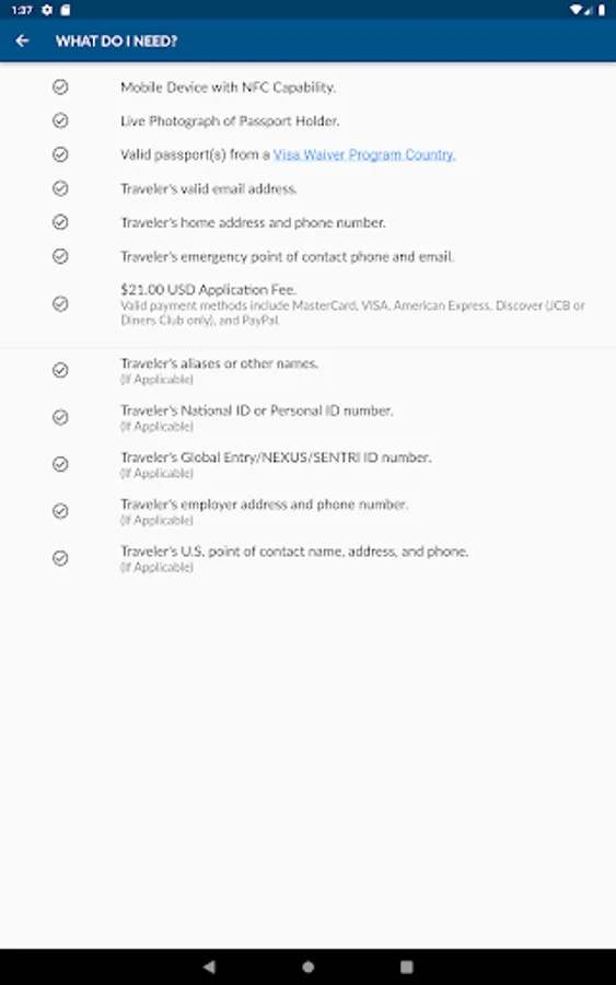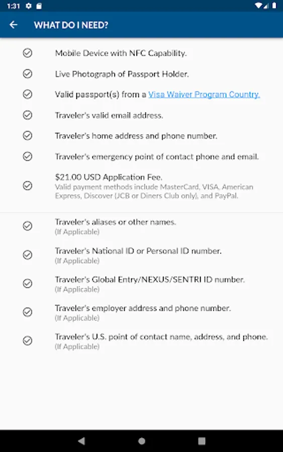The Electronic System for Travel Authorization (ESTA) app from U.S. Customs and Border Protection allows Nationals of Visa Waiver Program (VWP) countries to apply and pay for a travel authorization without a visa. The ESTA app is a mobile version of the ESTA application process and information that can also be found on the ESTA website at https://esta.cbp.dhs.gov.