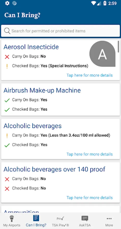 + Quickly search which items you can bring with you through the checkpoint onto the airplane.
