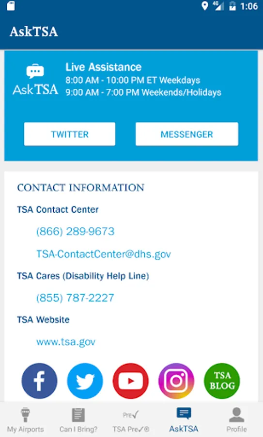 + Request live assistance from TSA through the AskTSA social media integration.