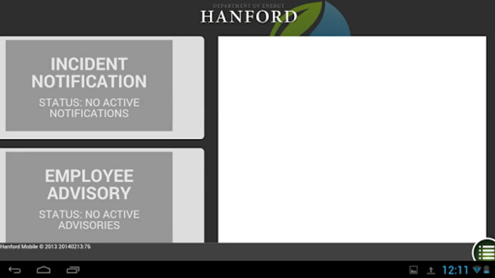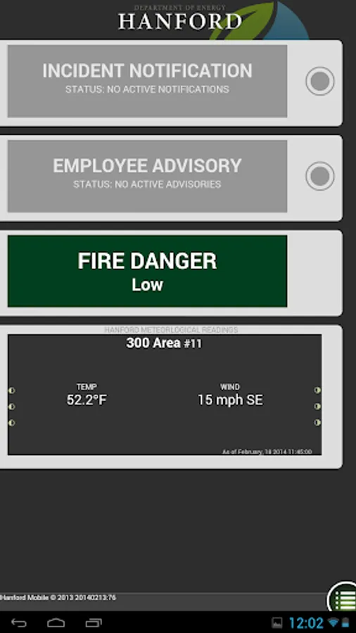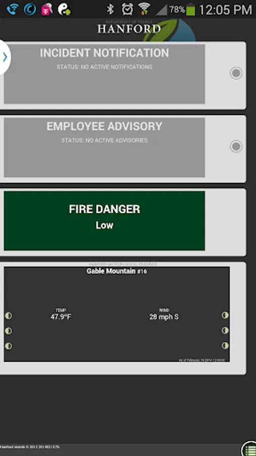 The Hanford.gov Mobile App brings you Hanford Incident notifications, Employee Advisory notifications, Fire Danger information, Red Flag warnings, Hanford Weather Station information and Hanford Employee lookup.