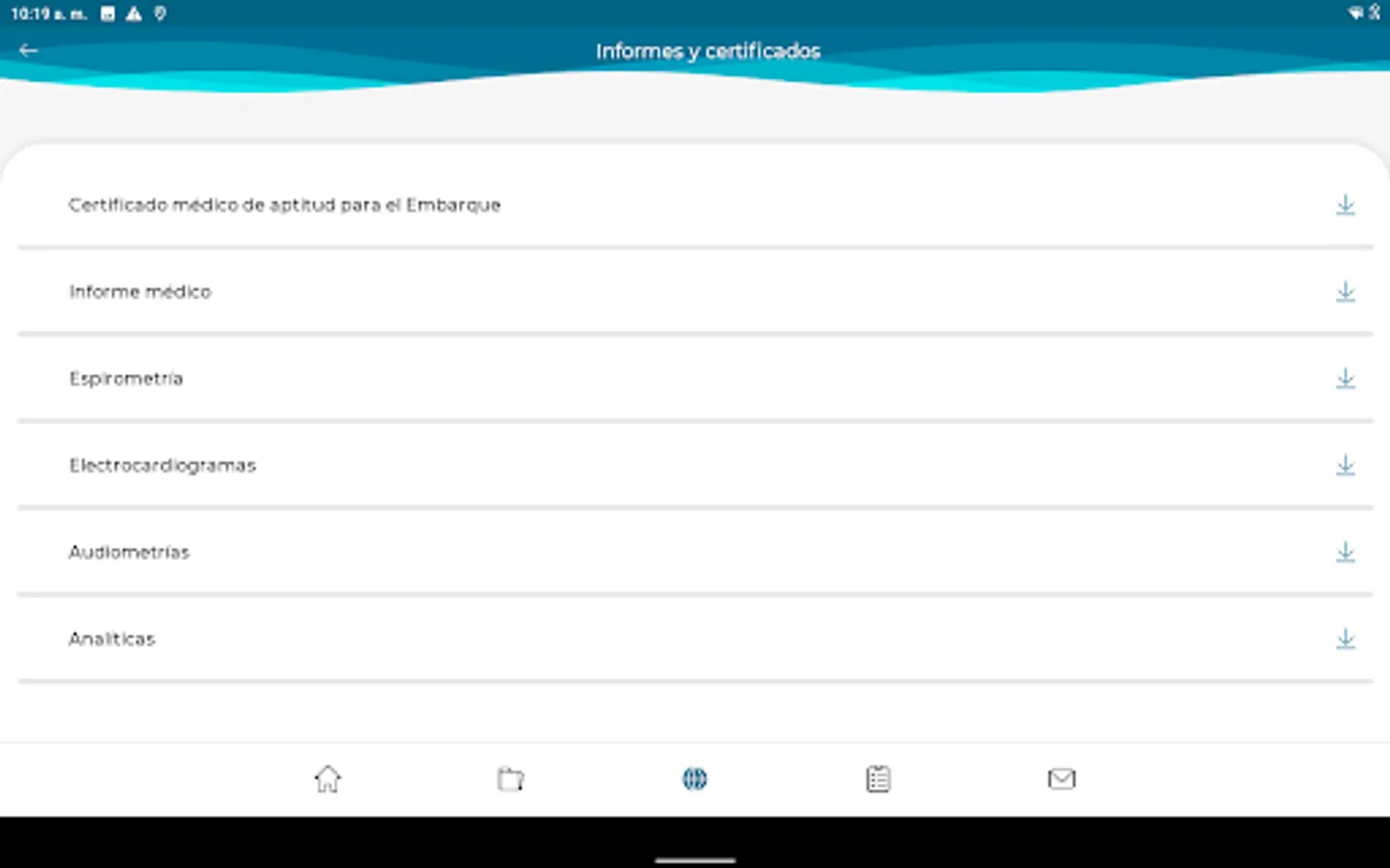 · In the Maritime Health area: You can download, among others, your medical reports and certificates (Medical Certificate of Fitness for Boarding, medical reports, spirometries, analytics, etc.), as well as access the hospital ship location service .