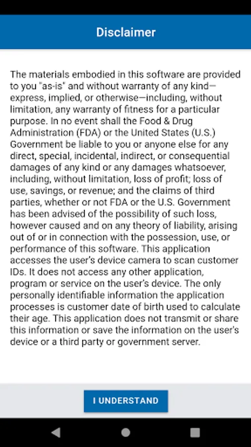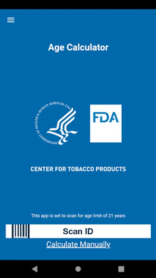 With the “FDA Age Calculator,” retailers can use their personal smartphones to help determine if the purchaser is old enough under federal law to buy tobacco products. Using the camera feature on a smartphone, the app is able to scan the driver’s license of the purchaser to determine if the customer is at least 21 years of age (the federal minimum age to buy a tobacco product). The birthdate listed on the photo id can also be manually entered into the app by the retailer for a quick age calculation. This application is only intended to assist retailers in calculating the age of the purchaser. This application does not check or verify whether an ID is real or authentic. Retailers are responsible for ensuring that they do not sell tobacco products to individuals under 21 years of age. This application does not transmit or share this information or save the information on the user’s device or a third party or government server.