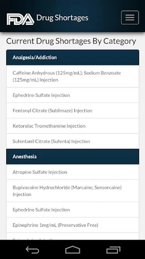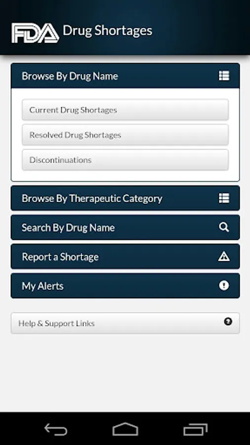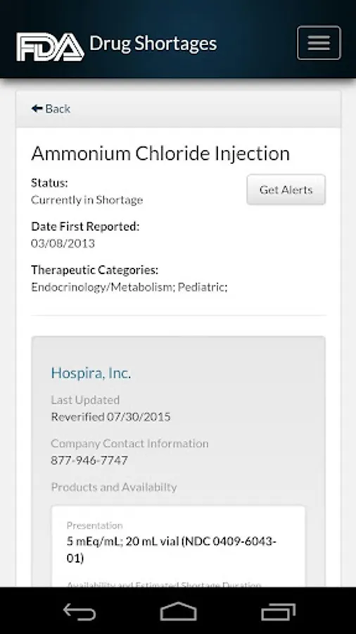 Drug Shortages 2 includes an Alerts feature. You can opt in to receive notifications on your mobile device when FDA adds or updates shortage information about a drug product or one or more drugs within a selected therapeutic category.