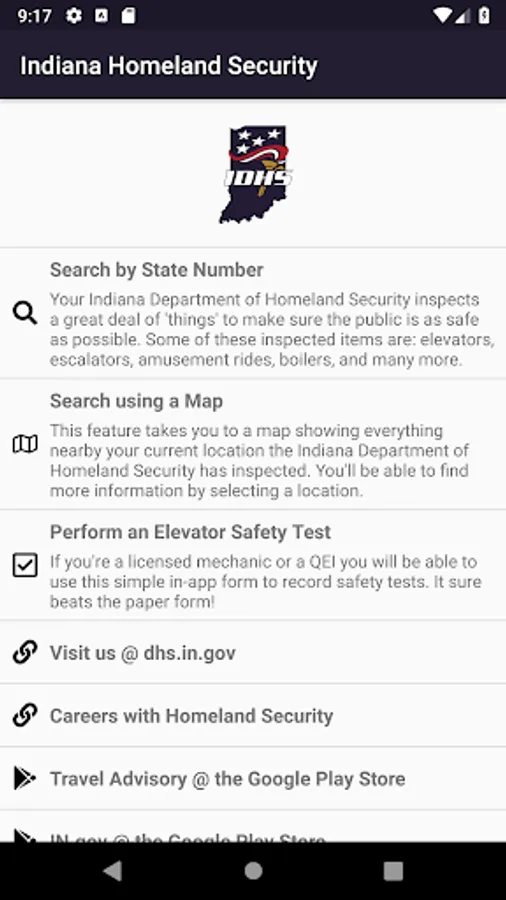 The Indiana Department of Homeland Security Public Safety app is a companion app to the Indiana Public Safety Portal. It provides Next Level access for our customers. For Elevator Mechanics and Inspectors, it provides a streamlined approach to submit your Elevator Safety Tests.