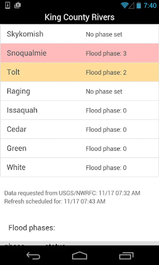 The King County Flood Warning app helps safeguard people and property by providing real-time flooding info for the Skykomish, Snoqualmie, Tolt, Raging, Cedar, Green and White rivers, and Issaquah Creek. If you live, work, go to school or regularly travel in or through these areas of King County download this app to track flood conditions. The app shows current river flows, flood stage data and forecasts plus real-time flood phases. Hydrographs make it easy to see several days of river data and forecasts. This app uses data from U.S. Geological Survey and National Weather Service and Northwest River Forecast Center downloaded every 10 minutes (source data update timing varies). Developed by King County and funded by the King County Flood Control District.