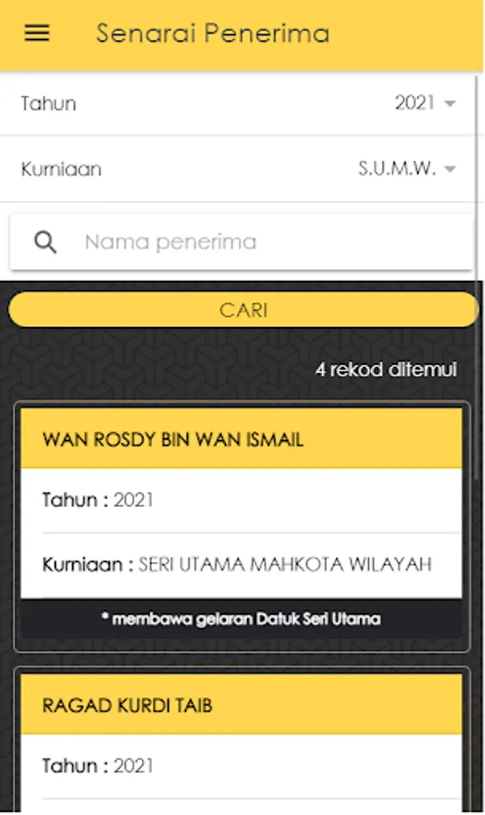 3. Senarai Penerima : Menyediakan fungsi carian senarai penerima mengikut tahun dan kurniaan.