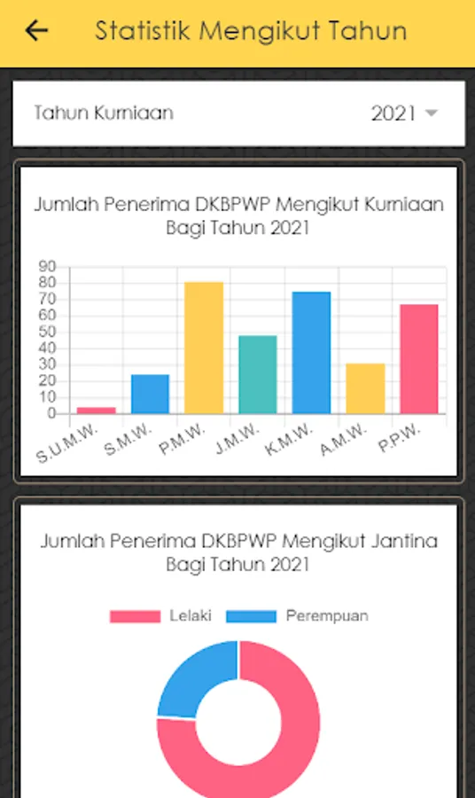 4. Statistik : Memaparkan statistik senarai penerima secara keseluruhan dan mengikut tahun.