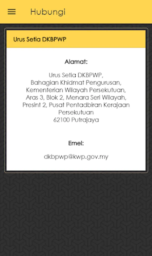 5. Hubungi Kami : Memaparkan alamat pejabat dan alamat emel urusetia DKBPWP.