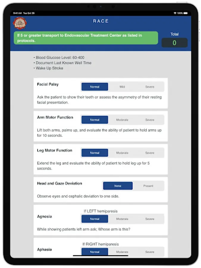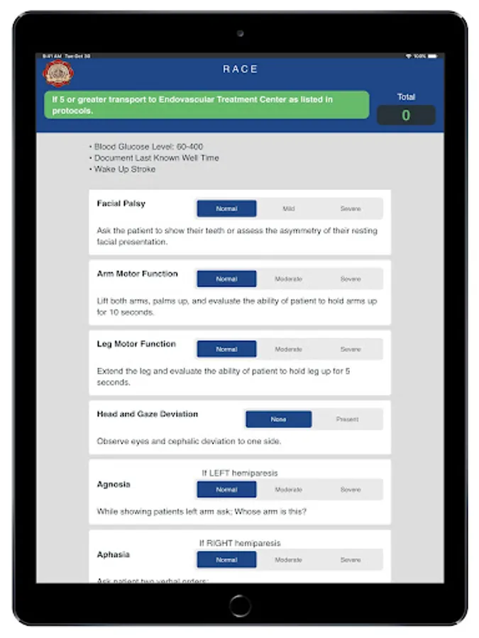 The RACE scale is an assessment tool for use by Fire Paramedics and Ambulance Franchise Partners to determine appropriate treatment response to rapid arterial occlusion also known as stroke symptoms recognized when evaluating patients in the field. This tool predicts large vessel occlusion (LVO) in patients possibly suffering from acute stroke based on symptom presence of moderate to severe facial palsy, arm and leg motor impairment, head and eye gaze deviation with left or right hemiparesis.