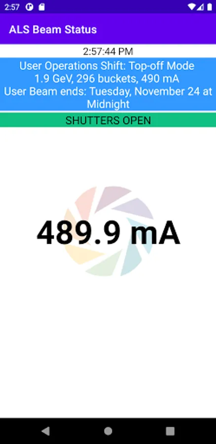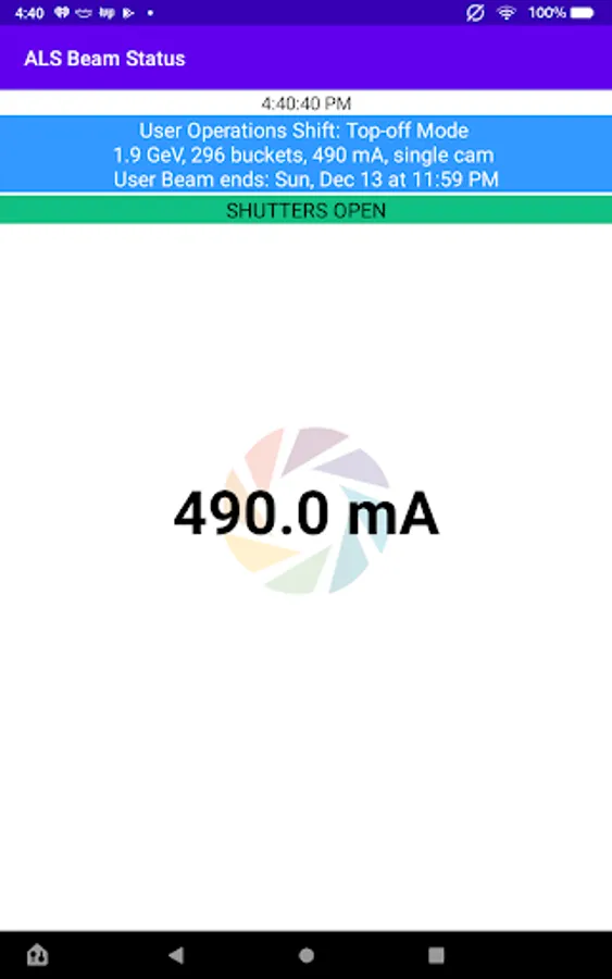 The ALS Beam Status app displays some of the information found on the web version of ALS's beam status that can be viewed at https://als.lbl.gov/beam-status/ Information that can be displayed right now is shutter open/closed, beam current, the 12-hour beam history graph, the main comment, and when available, the secondary comment. Future versions of the app will include various notifications.