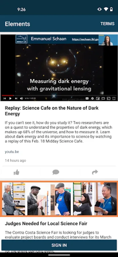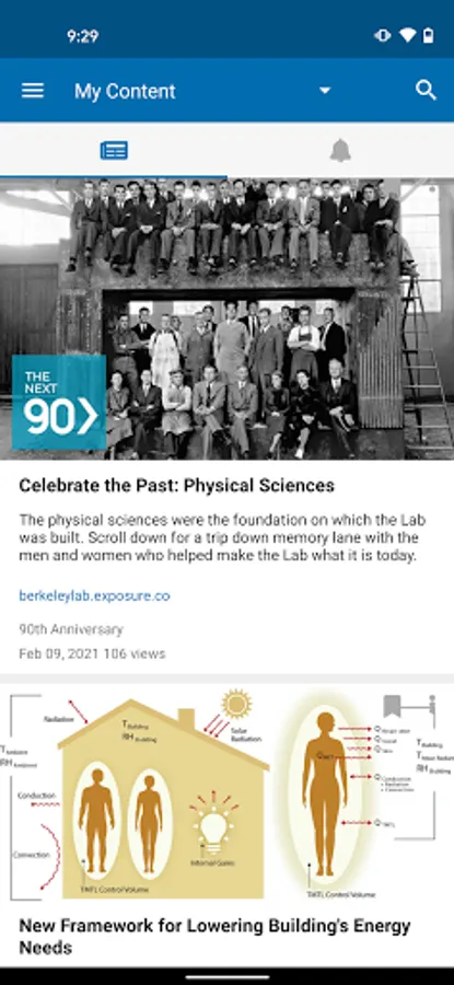 The Elements app provides Berkeley Lab ambassadors with the news and information they want and need on their mobile device. Users can personalize their experience by subscribing to the news categories they are most interested in. They can also share posts via their social media accounts, email, or text, as well as message other users.