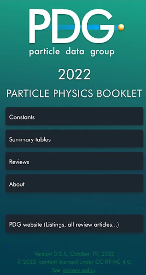 This is the official Booklet app from PDG. It will be updated whenever new editions of the Review of Particle Physics are published.