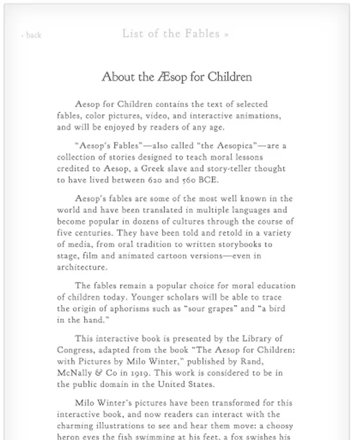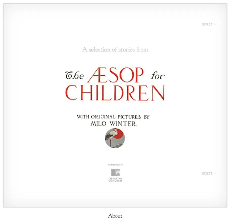This interactive ebook is presented by the Library of Congress, adapted from the book “The Aesop for Children: with Pictures by Milo Winter,” published by Rand, McNally & Co in 1919. This work is considered to be in the public domain in the United States.