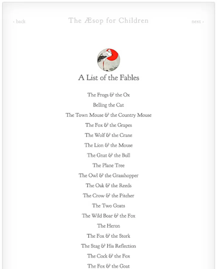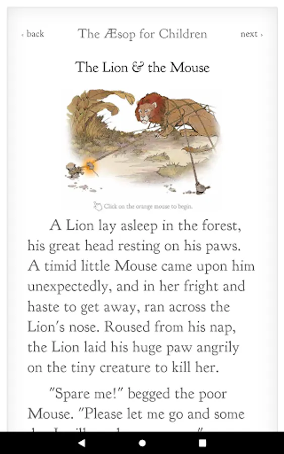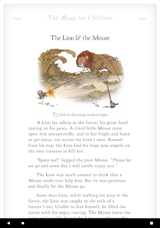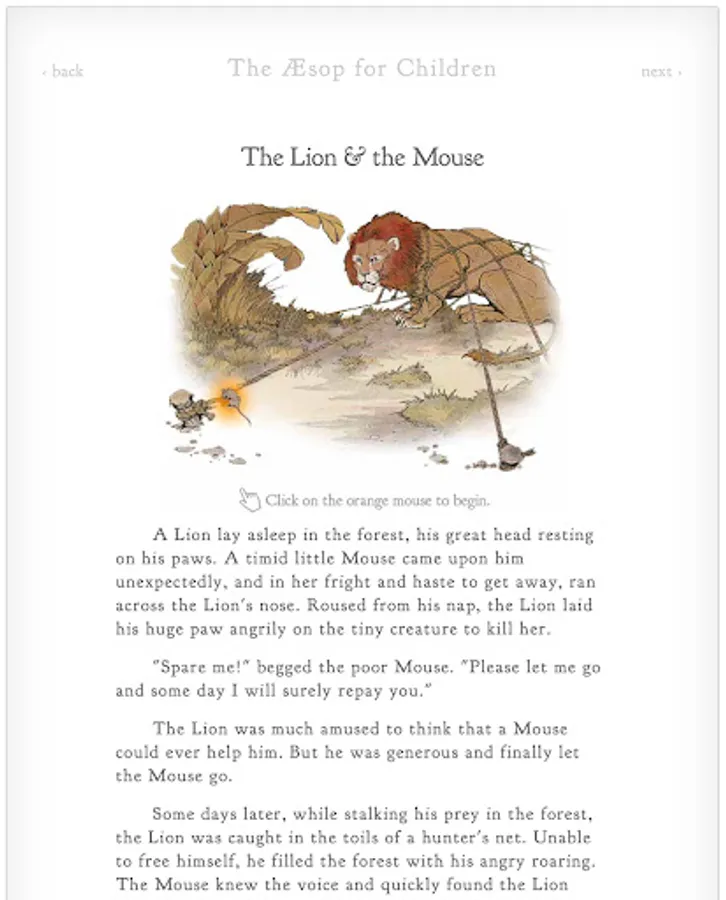 The Aesop for Children interactive book is designed to be enjoyed by readers of any age. The book contains over 140 classic fables, accompanied by beautiful illustrations and interactive animations.