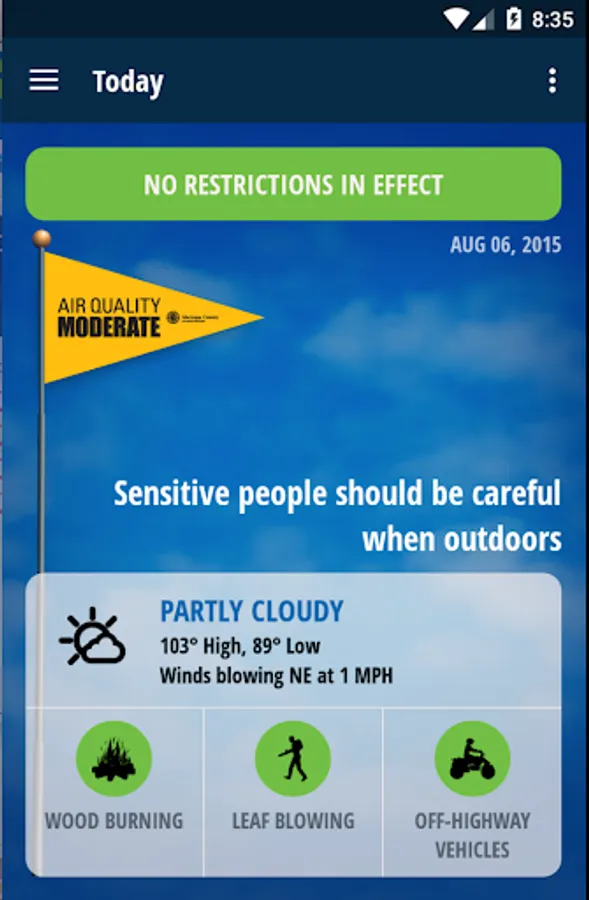 Get real-time information about air quality in Maricopa County, Arizona along with alerts about High Pollution Advisories, Health Watches and restrictions for activities such as woodburning, leaf blowing and off-highway vehicle use.