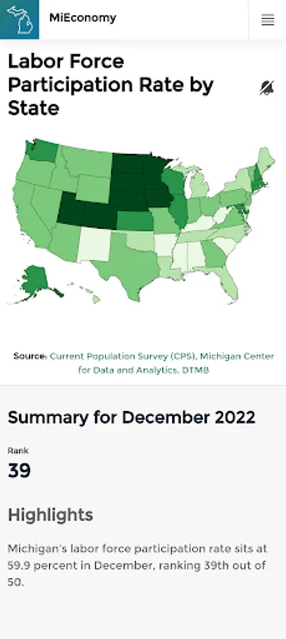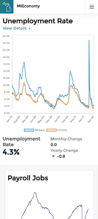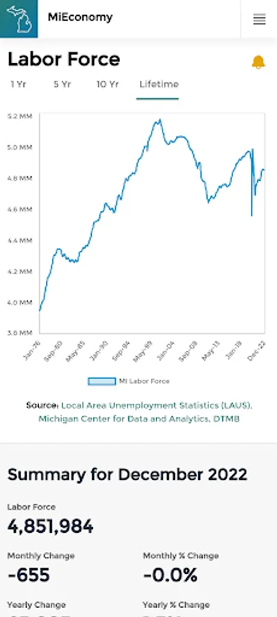 The MiEconomy app provides you with the key labor market and economic metrics necessary to stay informed on the Michigan economy. Using sources such as the Bureau of Labor Statistics, U.S. Census Bureau, and Bureau of Economic Analysis, this app provides same-day updates for 44 metrics including the unemployment rate, payroll jobs, and gross domestic product. The app is a product of the State of Michigan, DTMB Bureau of Labor Market Information and Strategic Initiatives, and Michigan Department of Treasury.
