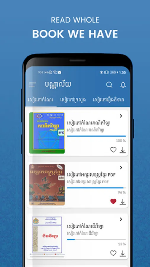 - e-books: PDF format version of official MoEYS textbooks as well as other significant Khmer e-books that users can freely access to them make them offline on their mobile devices.