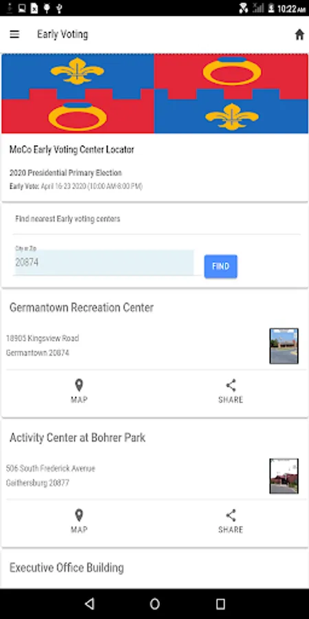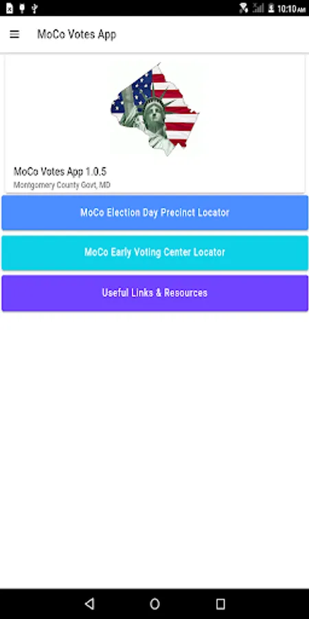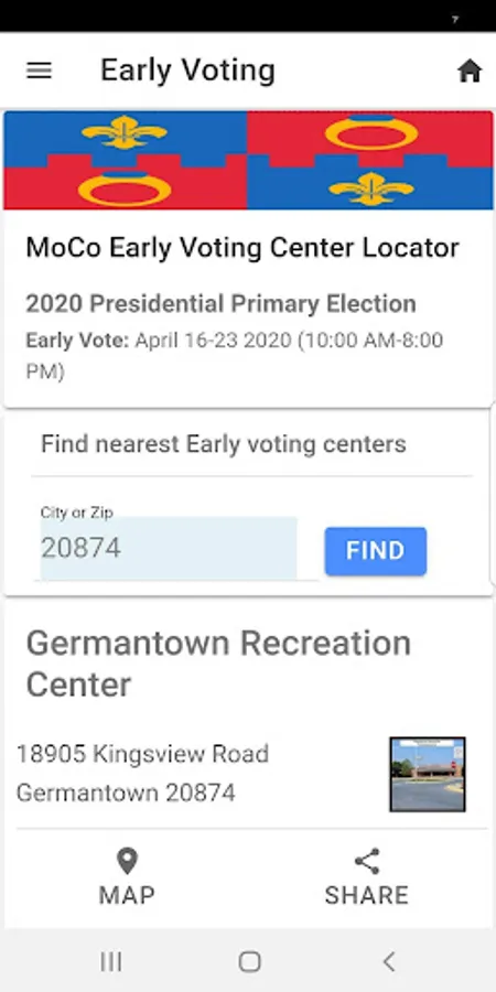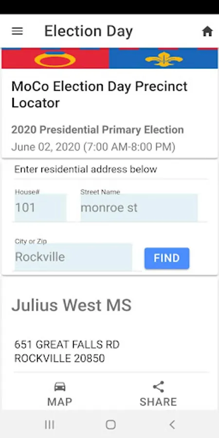 Montgomery County Govt, MD Voters App for the County citizens. The app helps the citizens find their voting precinct by their addresses and find the early voting precinct by their cities.