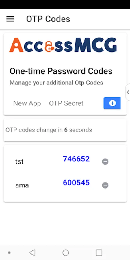 Multi-factor Authentication app for applications hosted by AccessMCG, Montgomery County Govt, MD. In addition, the app implements TOTP one-time password so that the user could do 2-factor auth even when Wi-Fi is not available. The TOTP one-time password functionality is extended as "Personal OTP Codes" screen for user to use this single app to do 2-factor auth with any other apps such as Office365, Amazon.