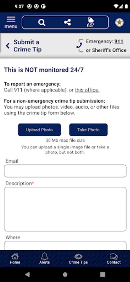 The app has public information for press releases, inmates, most wanted, sex offenders, and special alerts. Crime tips and contact us messages can be sent to the Sheriff's Office.