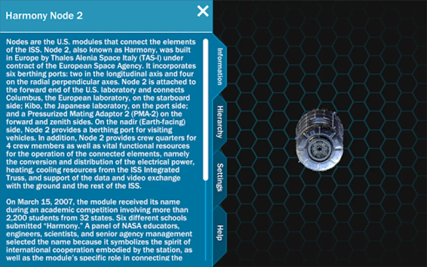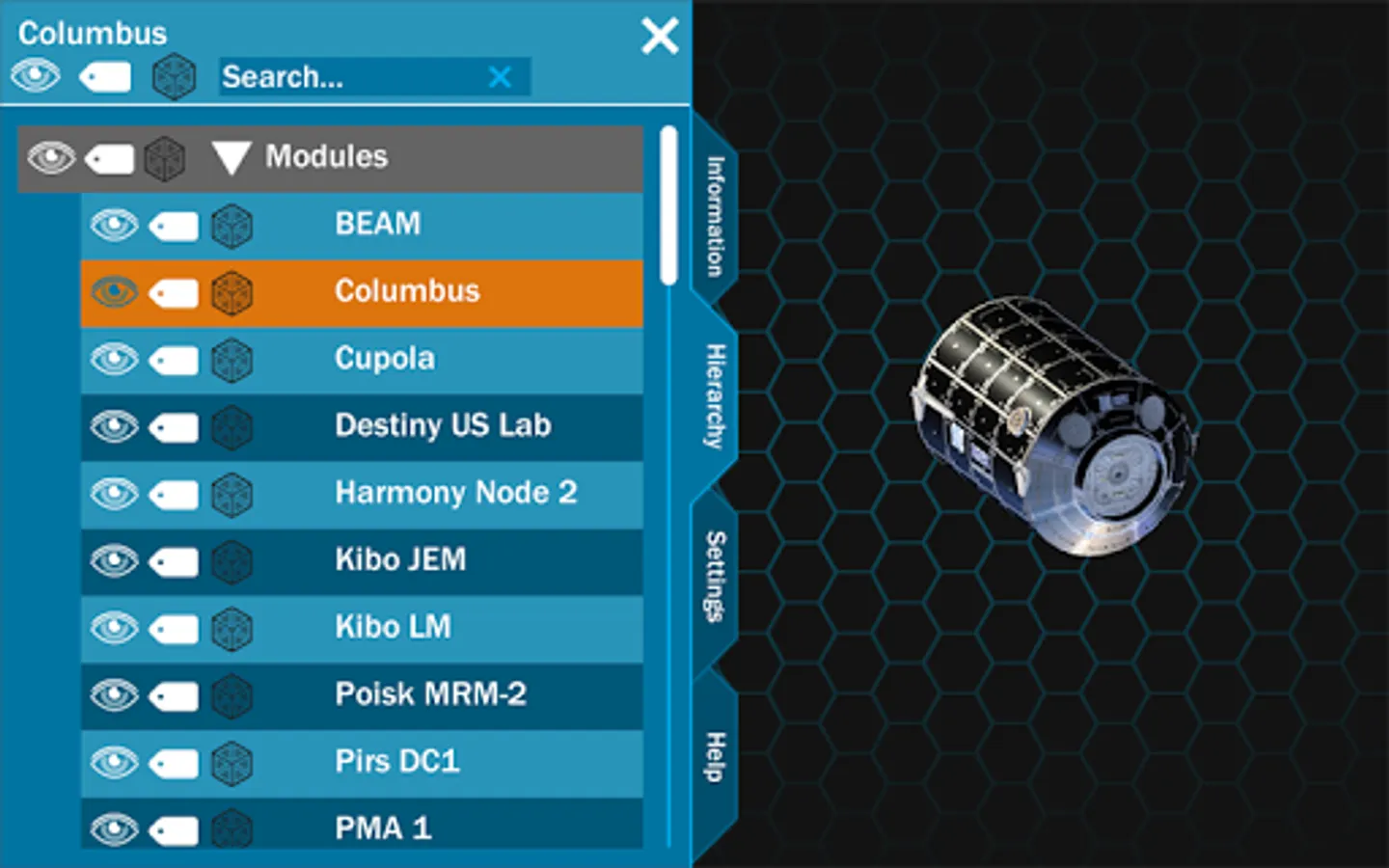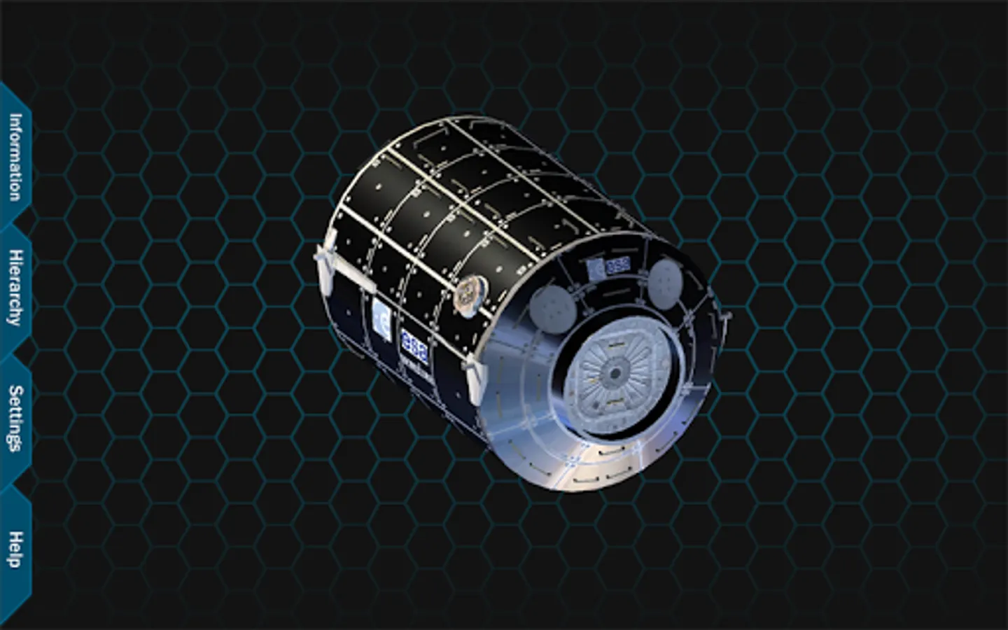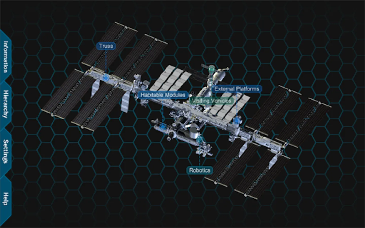 When the application starts, you can see a view of the entire ISS with category labels. Tabs are available on the left hand side of the screen which allow you access to information, the hierarchy, settings and application information. From this point, you can zoom into the station, revealing more labels of visible parts. The station can also be rotated to view from different angles. If a part is selected, the part is isolated so that you can focus on the specific piece. The information tab shows information about the currently isolated part.