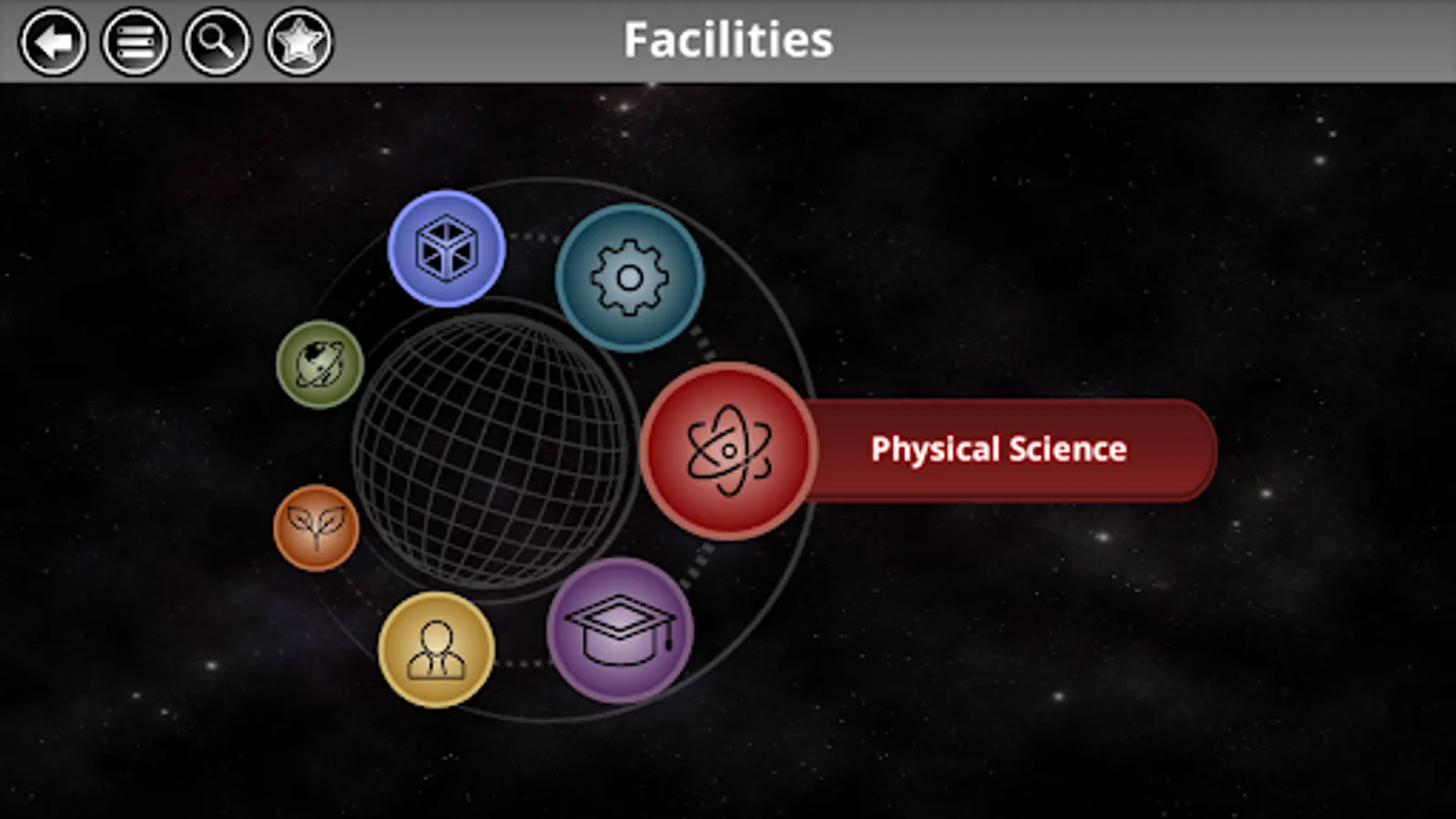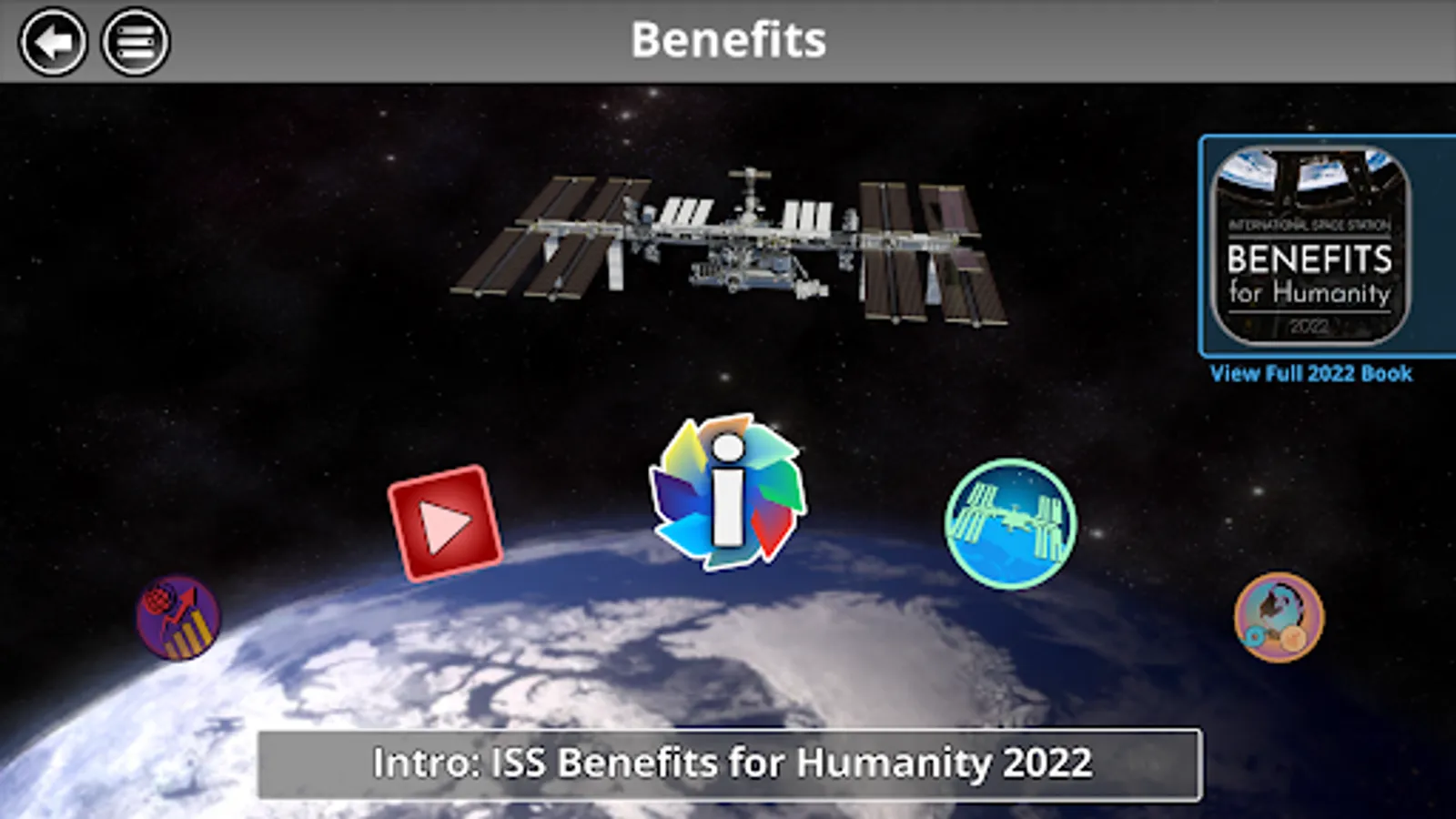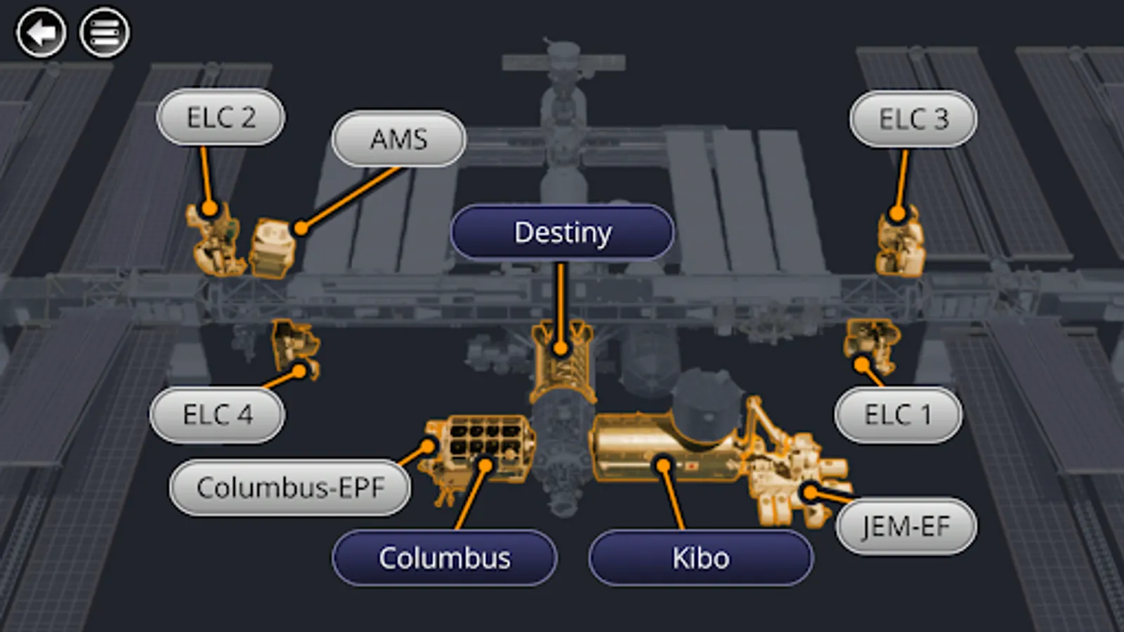 The Lab Tour section provides an interior view of three of the station modules; Columbus, Kibo, and Destiny, and an exterior view of seven external facilities; ELC1-4, Columbus-EPF, JEM-EF and AMS. The module interiors can be navigated by dragging up and down to see different sides of the module and left and right to view any racks not shown on the screen. Tapping a rack gives a brief description of the rack and an experiment description if available. For the externals, the platform is shown and can be rotated and zoomed. Payloads on the external racks are labeled and the labels can be selected for more information.