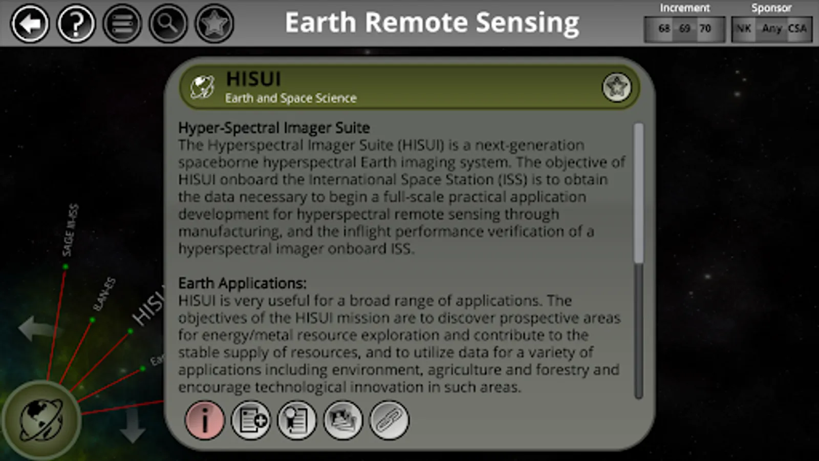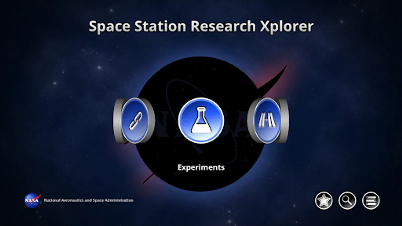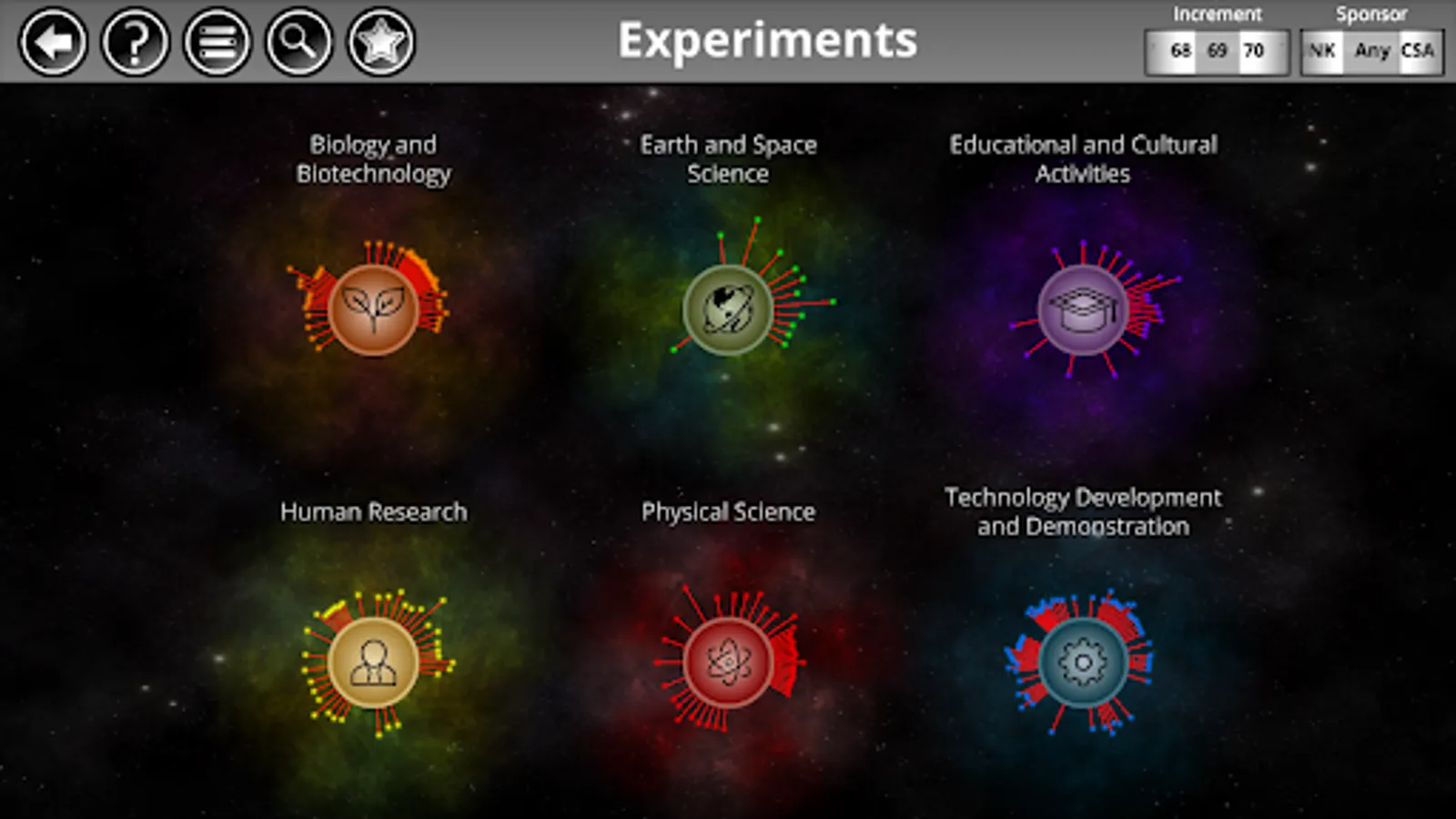 The Experiments section provides access to the six main experiment categories and their subcategories. Experiments are depicted as dots within the category system and the stems connecting the dots to the system depict the length of time the experiment spent on orbit. Users can drill down to see specific experiments within the categories and subcategories or search for a specific experiment or subject using the search option. Experiment descriptions consist of links, images, and publications if available. The Experiments section can be further narrowed by selecting a specific expedition and sponsor by using the dials at the top right of the screen. Experiments can be added to a favorites list for quick access.