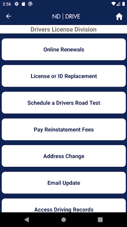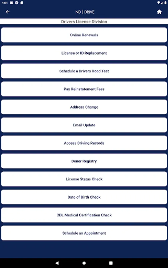 The ND Drive app will allow users to renew their driver license, request a replacement license or ID card, request a driving record, schedule a driving test and pay reinstatement fees. It will also allow a user to update their permanent address, temporary address, and email address. The app will also allow users to update donor status, check the current status of a license or medical certification, and schedule an appointment for in-person service.