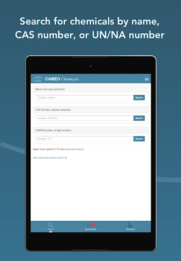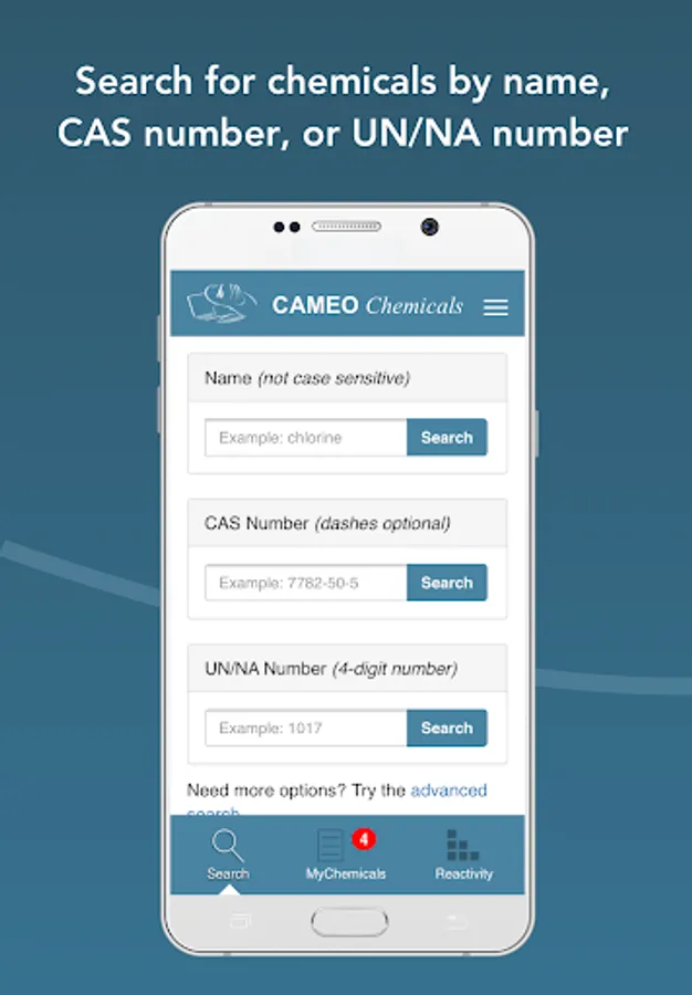 • Search by name, CAS number, or UN/NA number to find chemicals of interest in the extensive database of thousands of hazardous substances. Includes "type ahead" feature for simplified chemical name searches. An advanced search with additional search criteria is also available.