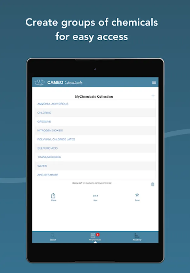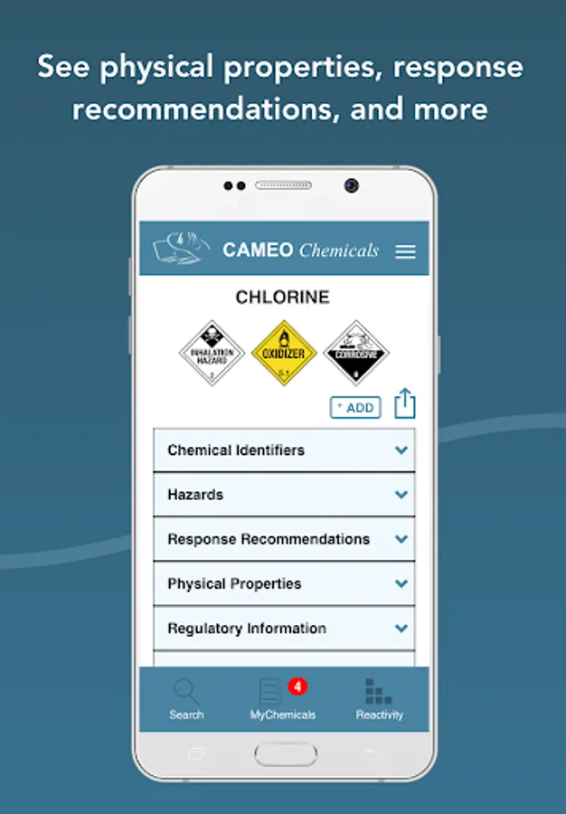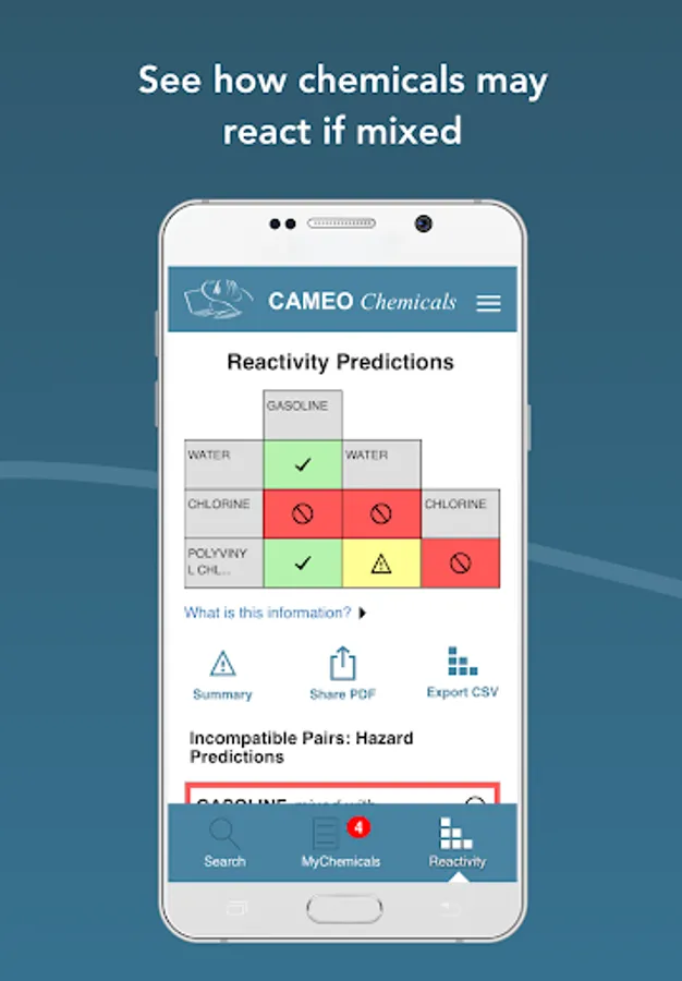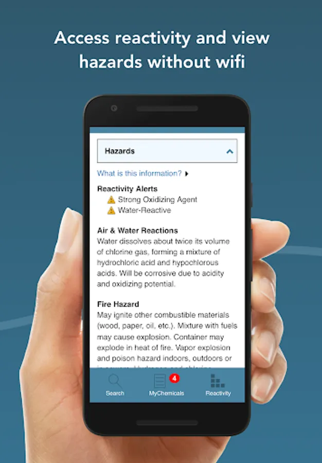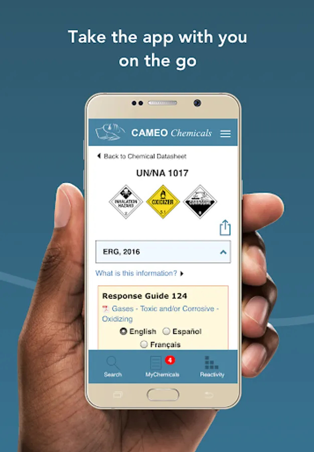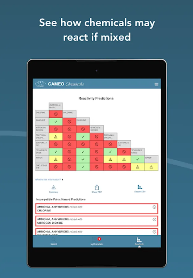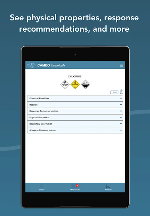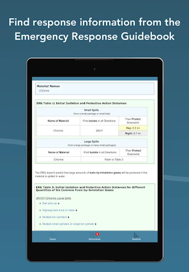 • Get offline access: the app runs without an internet connection. You can search for chemical and UN/NA datasheets, view ERG Response Guide PDFs and U.S. Coast Guard CHRIS PDFs, create MyChemicals collections, and view reactivity predictions--all while you're offline. When you're online, you can also go to additional resources on external websites (such as the NIOSH Pocket Guides and the International Chemical Safety Cards) from the app.