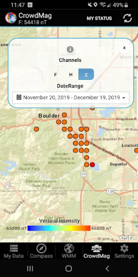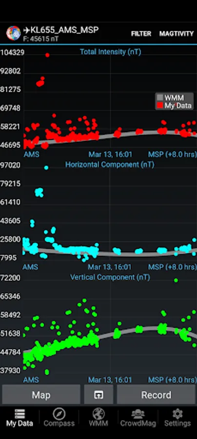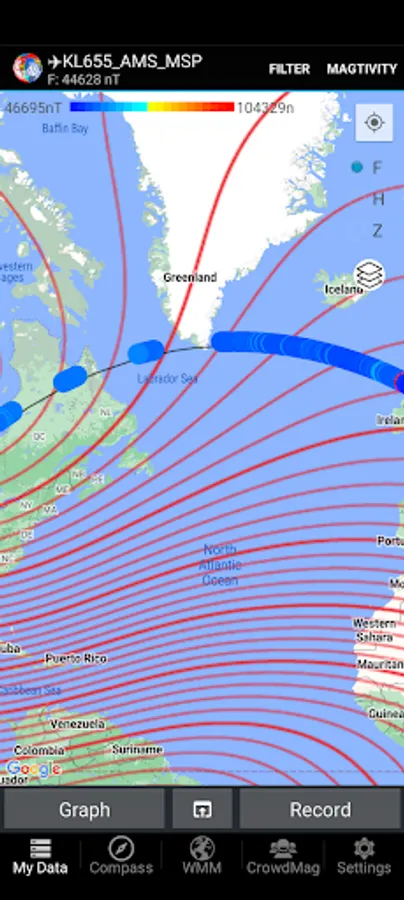 CrowdMag is an app that lets you measure the local magnetic field using your smartphone. You can view the data as a graph or a map in nanotesla units. CrowdMag measures the Z (downward component), H (horizontal intensity), and F (total intensity) magnetic field components. You can use CrowdMag for measuring magnetic data during outdoor activities, while flying, or to conduct your own experiments. You can also share it with NOAA to help scientists better understand Earth's magnetic field.