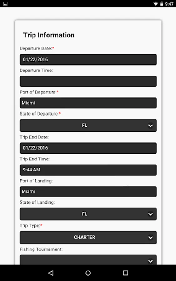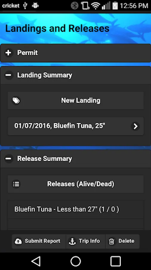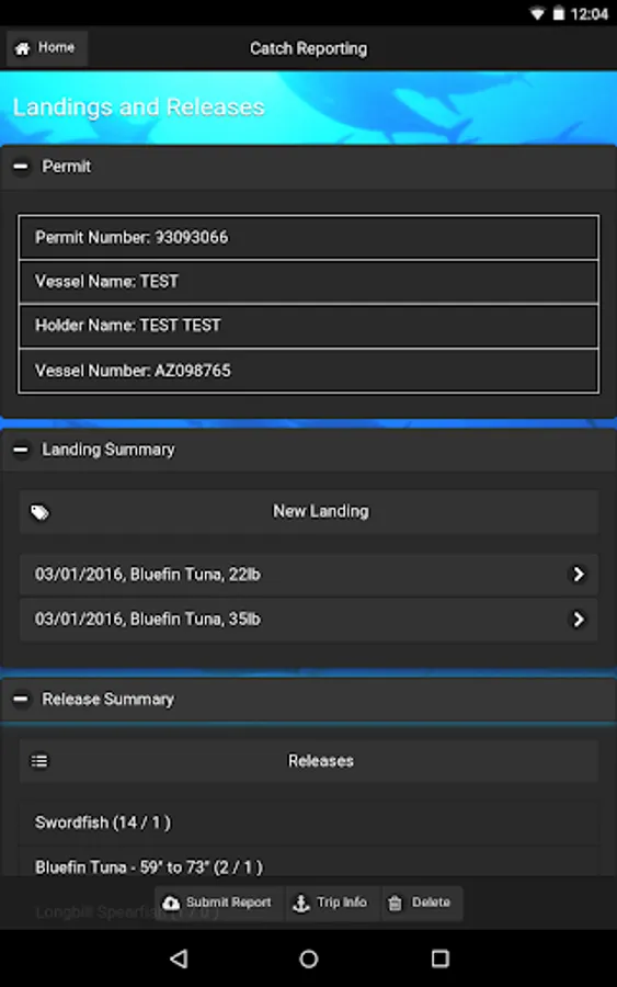 This app provides fishermen an easy accessible tool to record their trips and report catch of bluefin tuna, blue marlin, white marlin, roundscale spearfish, sailfish, and swordfish. This app allows fishermen record their HMS landings and releases during their fishing trips on the boat. The information is stored in the device. User can submit the report to HMS when Internet connection is available.