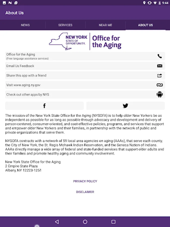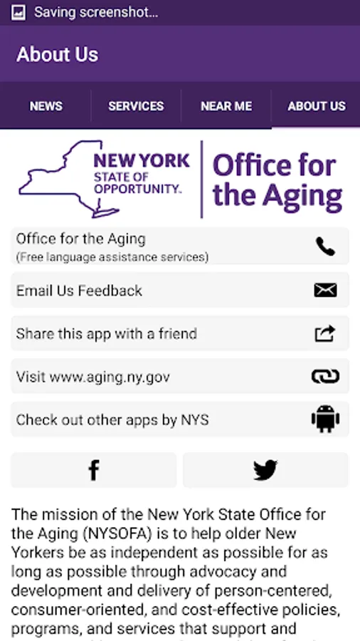 The mission of the New York State Office for the Aging (NYSOFA) is to help older New Yorkers be as independent as possible for as long as possible through advocacy and development and delivery of person-centered, consumer-oriented, and cost-effective policies, programs, and services that support and empower older New Yorkers and their families, in partnership with the network of public and private organizations that serve them.