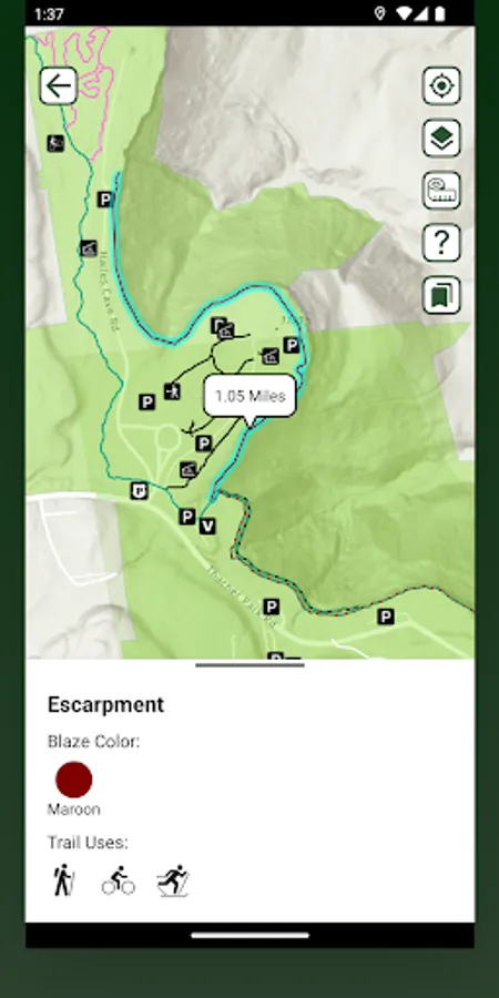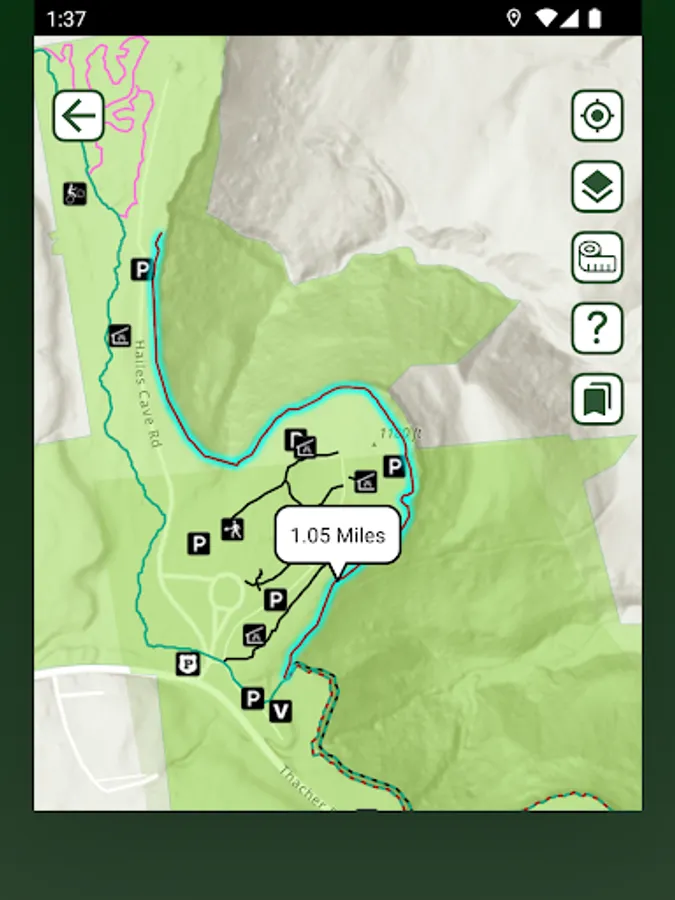 • Information about trails, park features, and amenities by simply tapping on a trail or icon;
